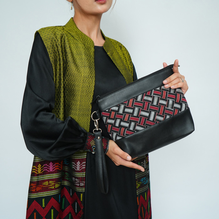 Menggunakan bahan katun khusus untuk tenun yang lembut dan kuat, dipadukan dengan kulit sintetis premium sebagai pelengkap. Kombinasi ini menciptakan produk bernuansa tradisional dengan sentuhan modern yang elegan dan fungsional.