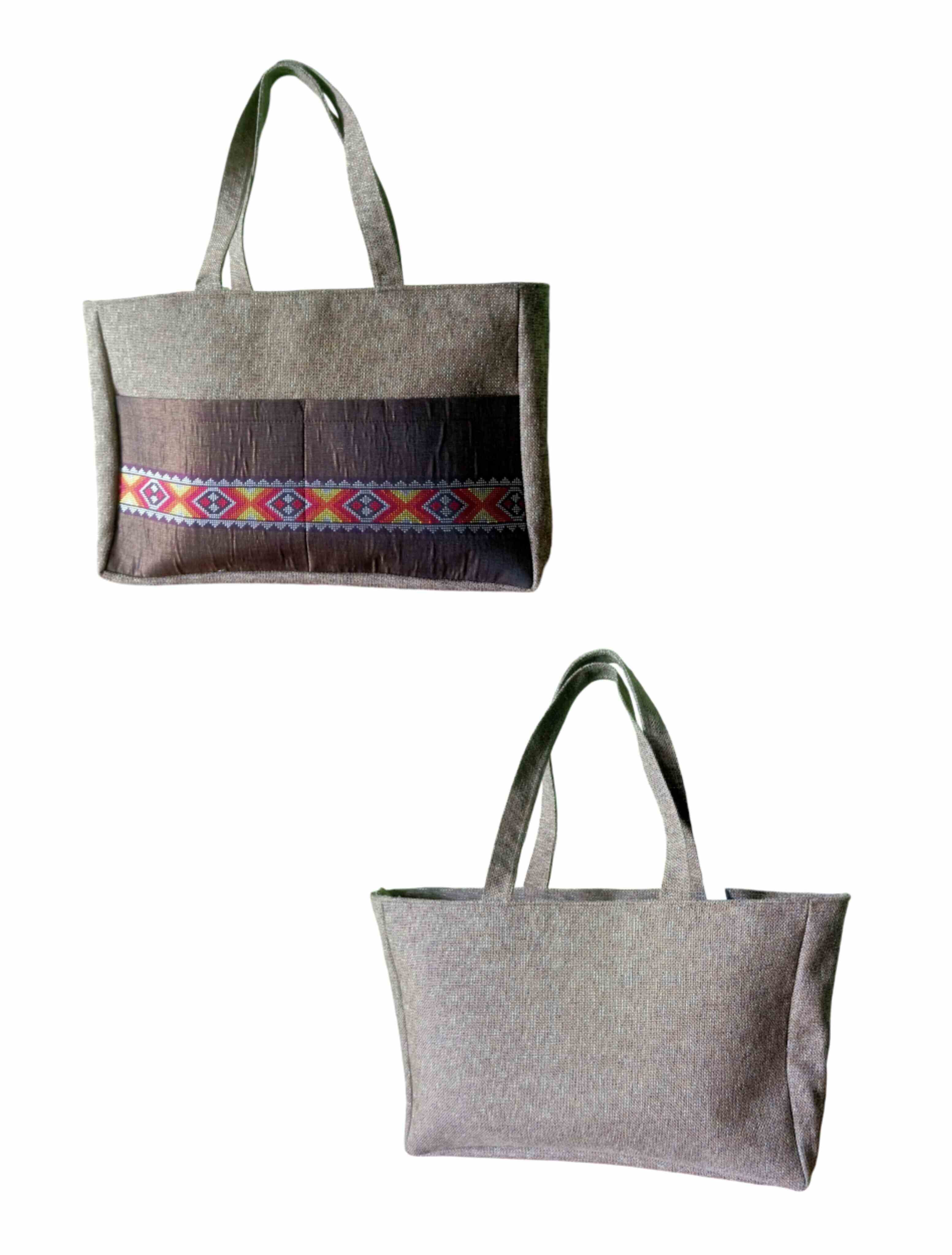 A tote bag with a large inner space, made from jute canvas mixed with Toba ulos woven fabric.