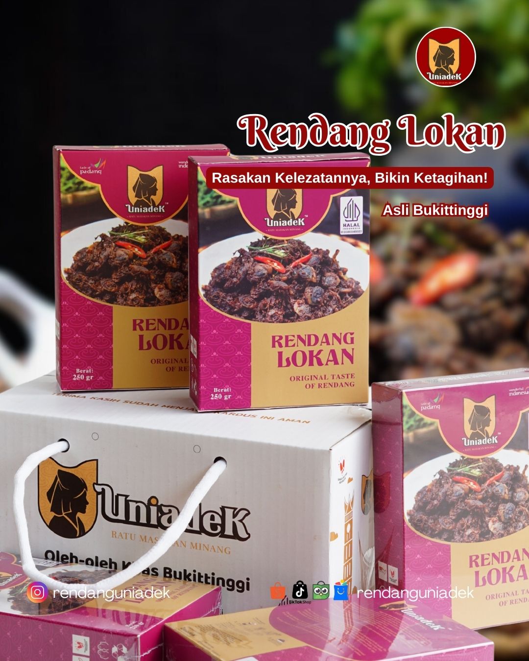 Rendang Uniadek Rendang Uniadek offers authentic West Sumatran rendang, especially from Bukittinggi, known for its rich, dark color and deep flavor developed through a traditional 13–14 hour cooking process. We serve a variety of regional specialties such as Beef Rendang, Lung Rendang, Shredded Beef, Eel Rendang (Batusangkar), Lokan Rendang (Pesisir Selatan), and Green Chili Duck (Bukittinggi). With its bold taste, attractive packaging, and shelf life of up to 6 months, Rendang Uniadek is a perfect culinary souvenir from Minangkabau.