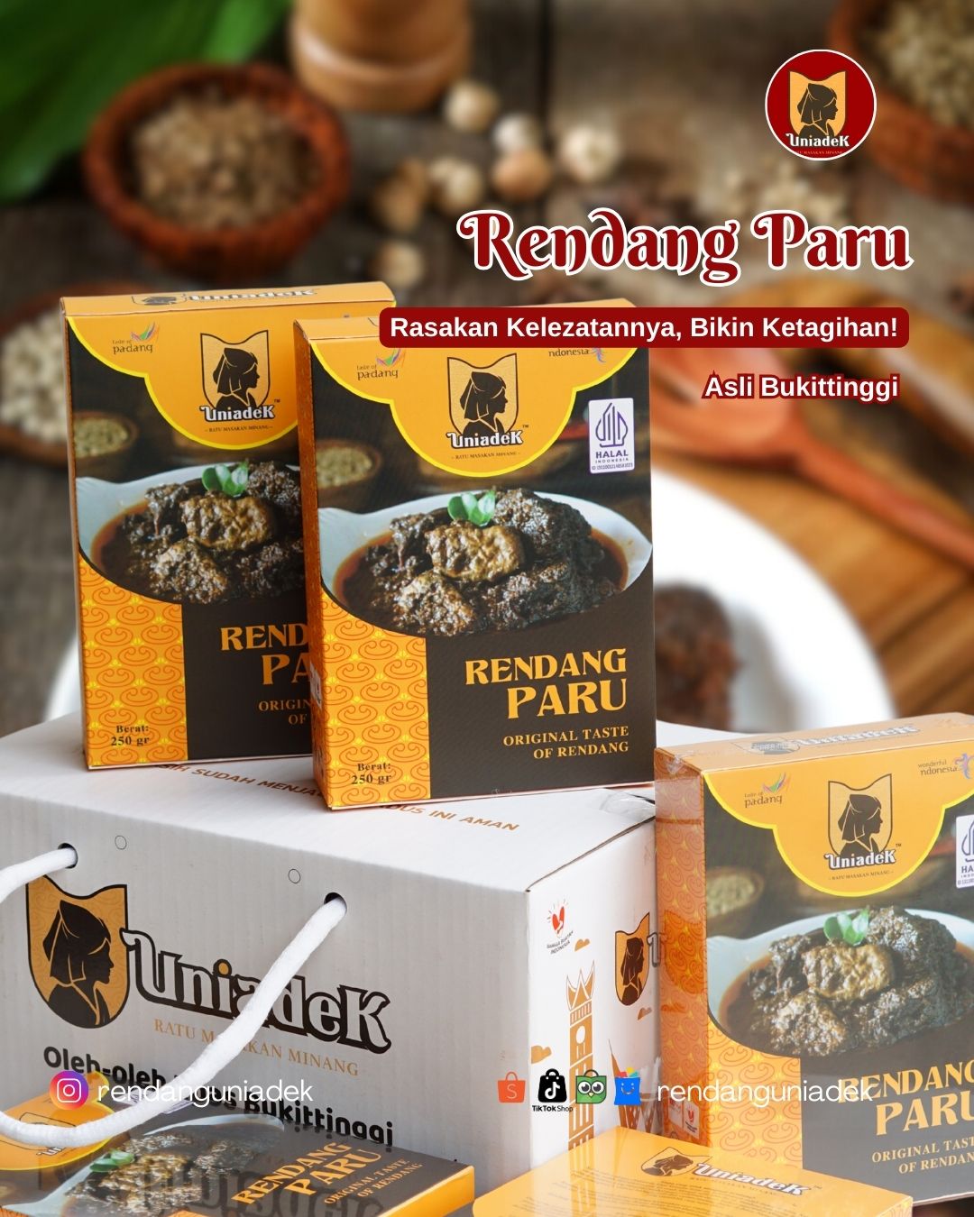 Rendang Uniadek Rendang Uniadek offers authentic West Sumatran rendang, especially from Bukittinggi, known for its rich, dark color and deep flavor developed through a traditional 13–14 hour cooking process. We serve a variety of regional specialties such as Beef Rendang, Lung Rendang, Shredded Beef, Eel Rendang (Batusangkar), Lokan Rendang (Pesisir Selatan), and Green Chili Duck (Bukittinggi). With its bold taste, attractive packaging, and shelf life of up to 6 months, Rendang Uniadek is a perfect culinary souvenir from Minangkabau.