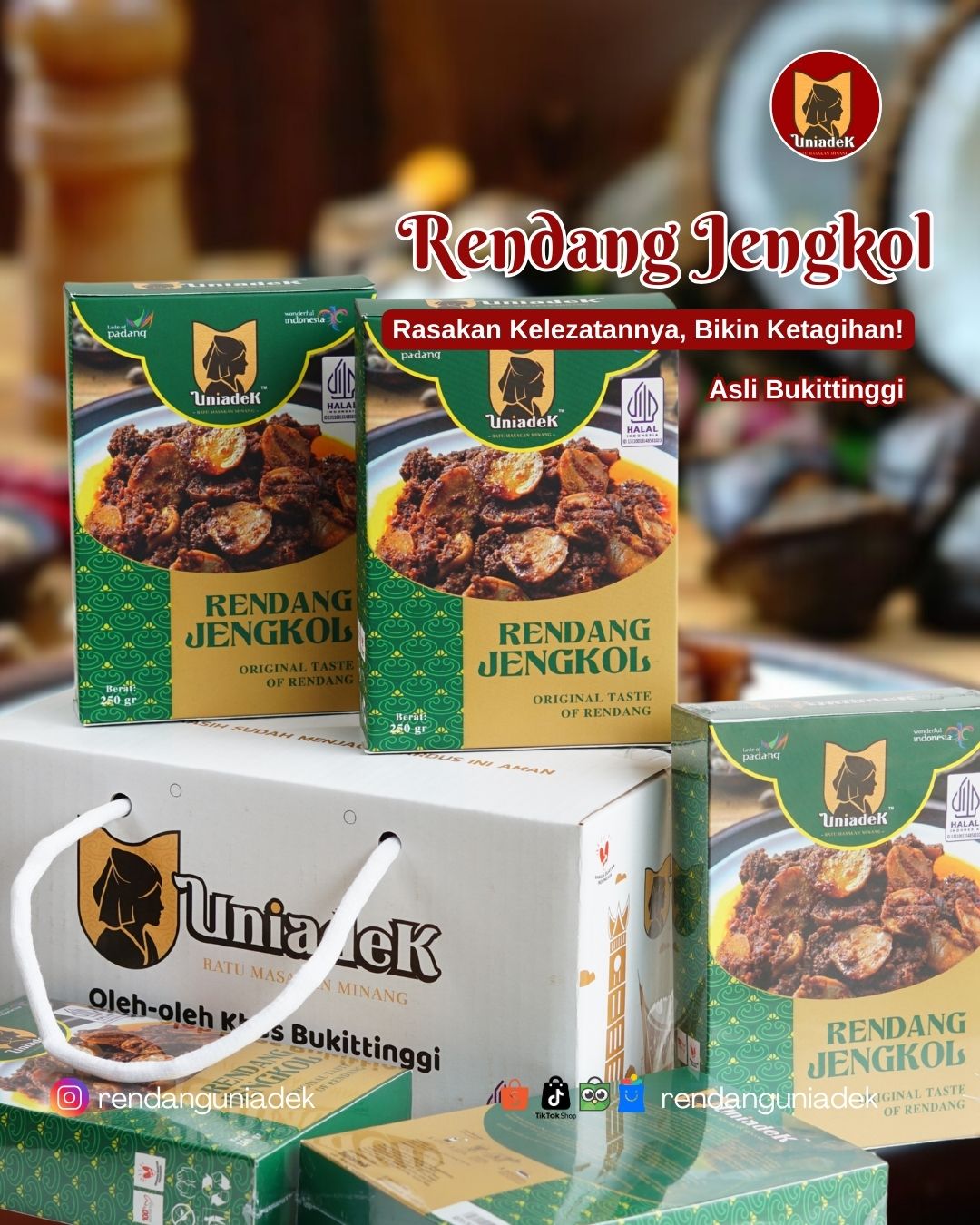 Rendang Uniadek Rendang Uniadek offers authentic West Sumatran rendang, especially from Bukittinggi, known for its rich, dark color and deep flavor developed through a traditional 13–14 hour cooking process. We serve a variety of regional specialties such as Beef Rendang, Lung Rendang, Shredded Beef, Eel Rendang (Batusangkar), Lokan Rendang (Pesisir Selatan), and Green Chili Duck (Bukittinggi). With its bold taste, attractive packaging, and shelf life of up to 6 months, Rendang Uniadek is a perfect culinary souvenir from Minangkabau.
