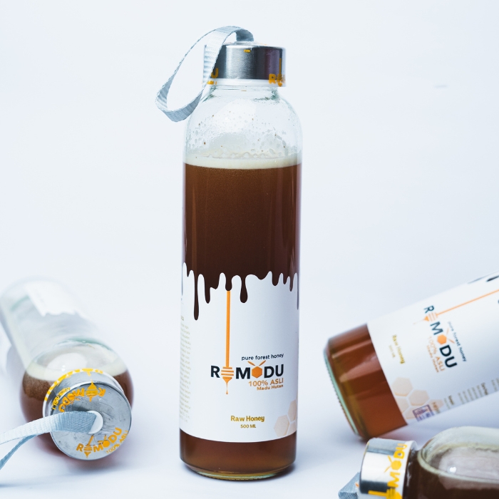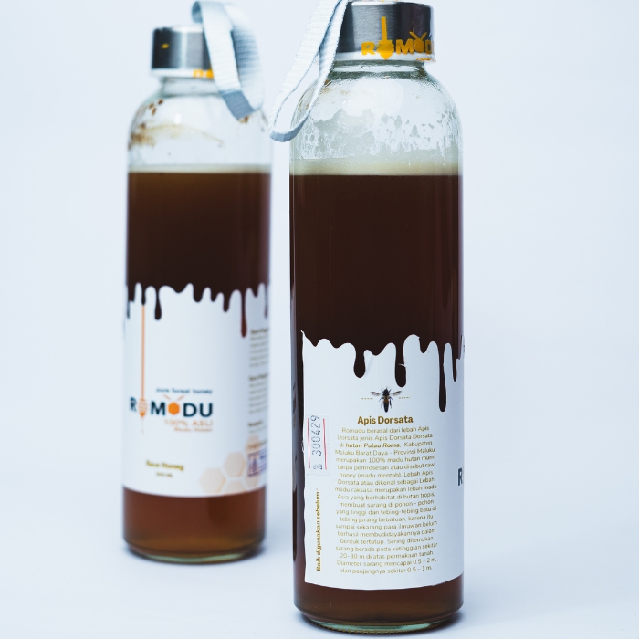 ROMADU 500 ML, packed in glass bottle so it is safe and without any mixture. ROMADU is 100% pure forset honey teken from the forest foto Roma Island In Southwest Maluku Regency (MBD) which is guaranted with permisssion from the Ambon City Health Office named PIRT dan have a Halal certificate. This varian have a multifunctional packaging which is it can also used as a water or juice bottle tumbler.