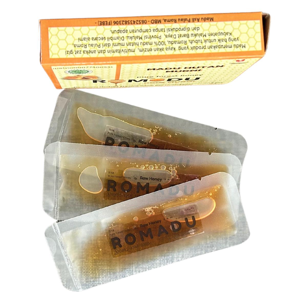 Taken from the forest of Roma Island, Southwest Maluku Regency, Maluku Province, ROMADU, 100% pure forest honey without preservatives. This honey is taken from the steep cliffs in the forest. Farmers is struggle to take it in tradisional ways but it is a source of livehood for the generations. And it is the main source of livelihood for the lokal people. However, the seling value of Thio honey is still very low. Therefore, we make a premmium psckaging from glass to raise up the seling value. And to reach a wider market, Romadu is packaged in an economical package, namely a 3-pack of sachets.
