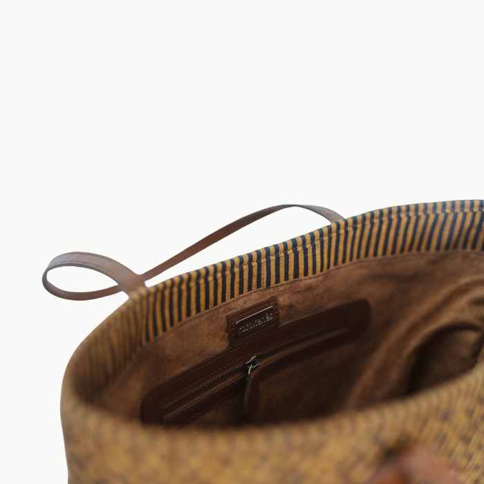 Lumbini mini is a tote bag made from woven lurik woven fabric, with genuine cowhide leather handles. On the inside using suede fabric, complete with two inner pockets and one zippered pocket. Can be used as a shoulder bag