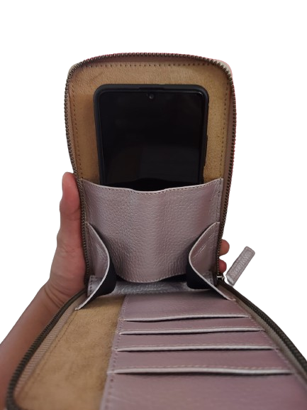 Rukmini bag, made genuine cowhide leather with woven part on the front and zipper as closure. The interior part is lined suede fabric, with a slip for cell phone and passport, and four card pockets. Pretty phone's hand bag for women with a detachable leather strap.