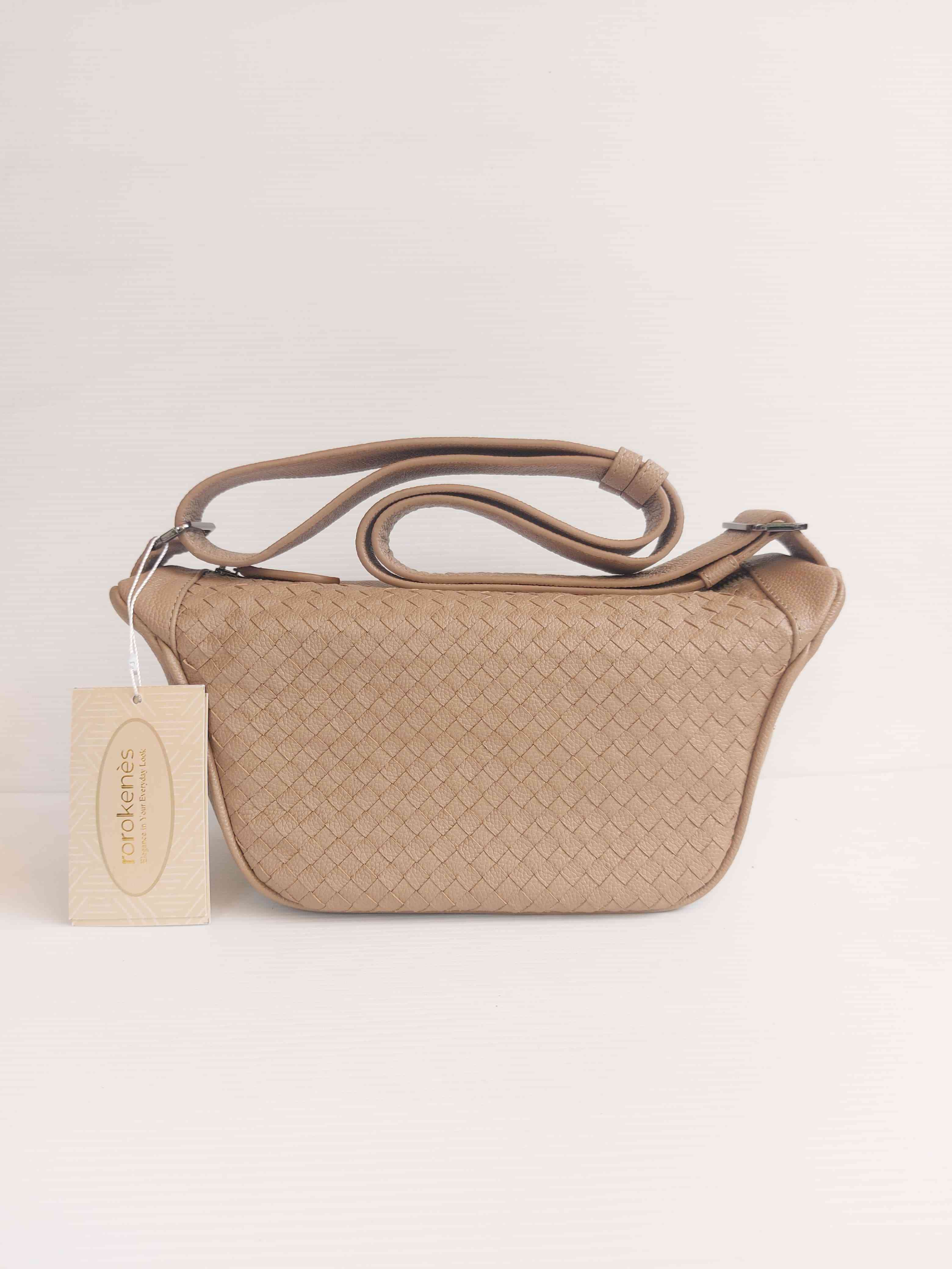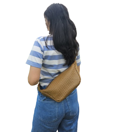 Banyu bag, made of woven genuine cowhide leather with zipper closure. The genuine cowhide leather strap is adjustable in length. The interior is lined with suede fabric, complete with two inner pockets and one zipper pocket. Perfect sling bag for men and women.