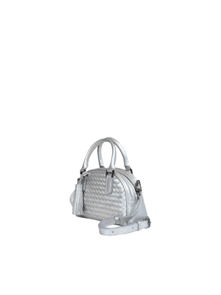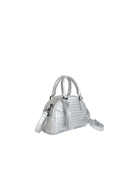 Handbag and slingbag with genuine cowhide woven on the front and back with zipper closure. Lined on the inside with suede fabric, there is an open pocket and a zipper pocket. It can be styled as a handbag or slingbag with the adjustable length detachable leather strap.