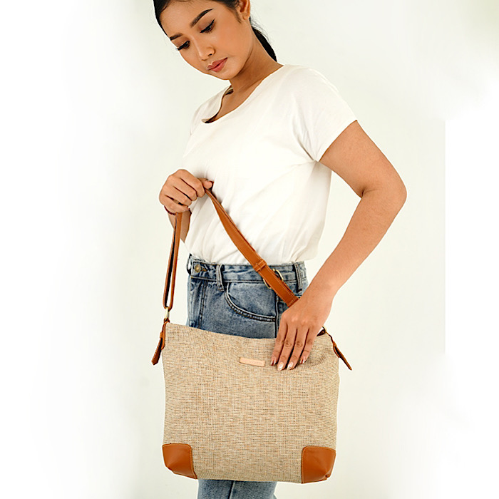 The combination of natural botanical and vegetable fibers, with a touch of woven Indonesian, is designed with the gonee tote bag model.