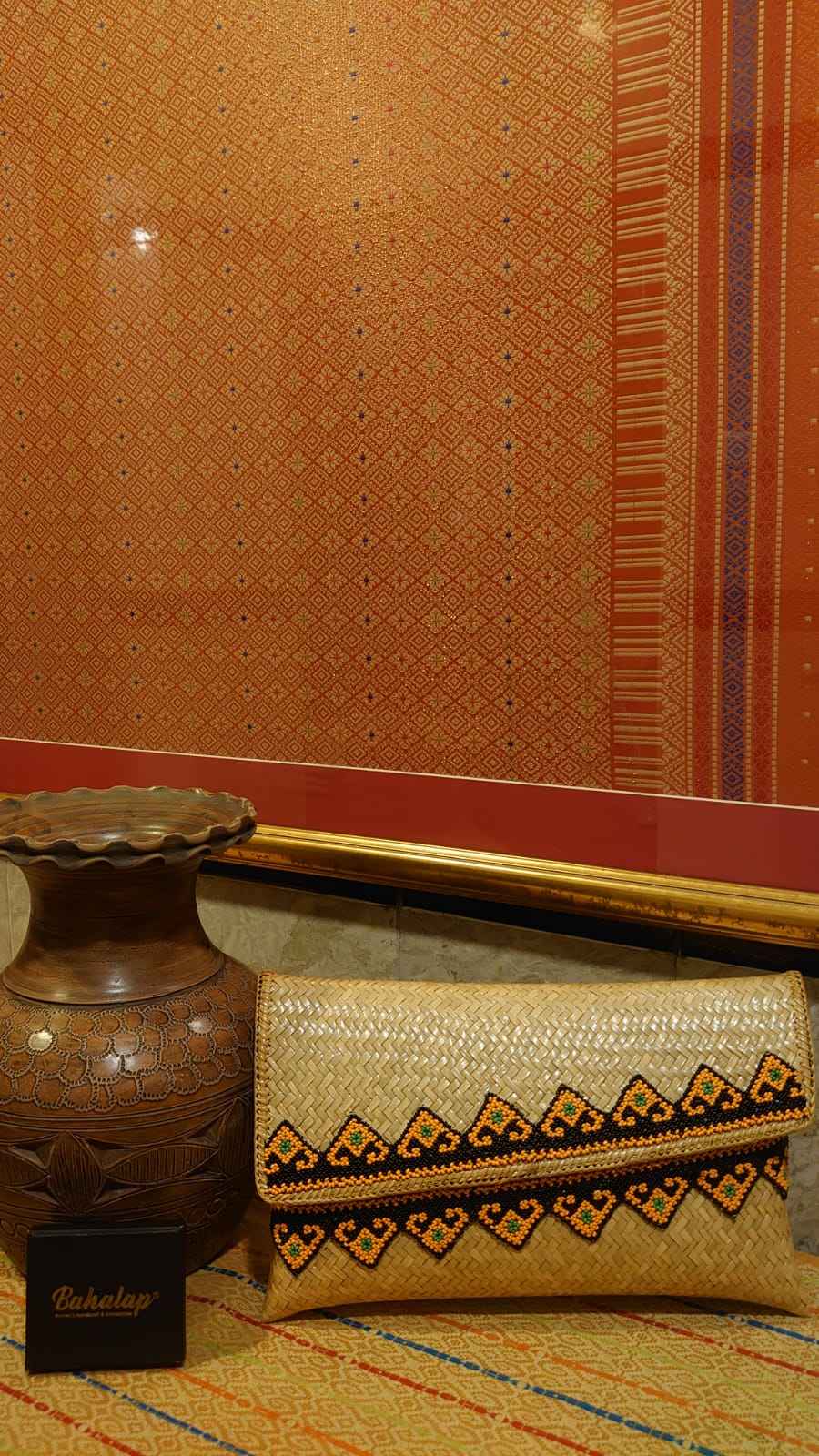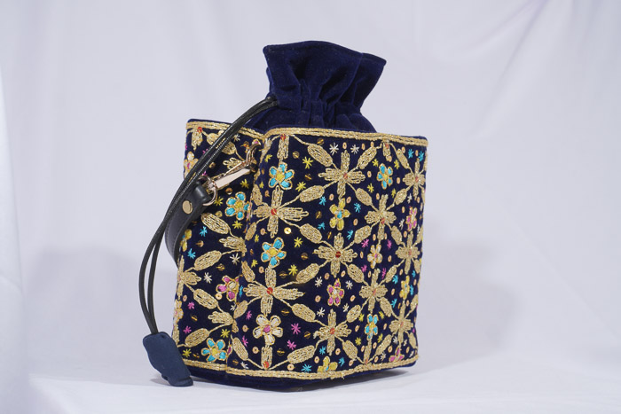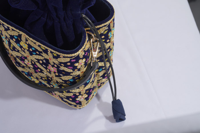 The front and back of the bag can function as pockets, which are made of velvet fabric decorated with Palembang's typical angkinan embroidery which is one of the handicrafts from the Srivijaya kingdom that uses gold threads.