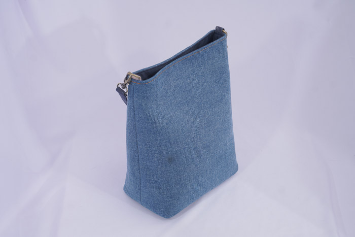 The body of this bag is made of light blue jeans, with a pocket application on the front using Palembang jumputan fabric.