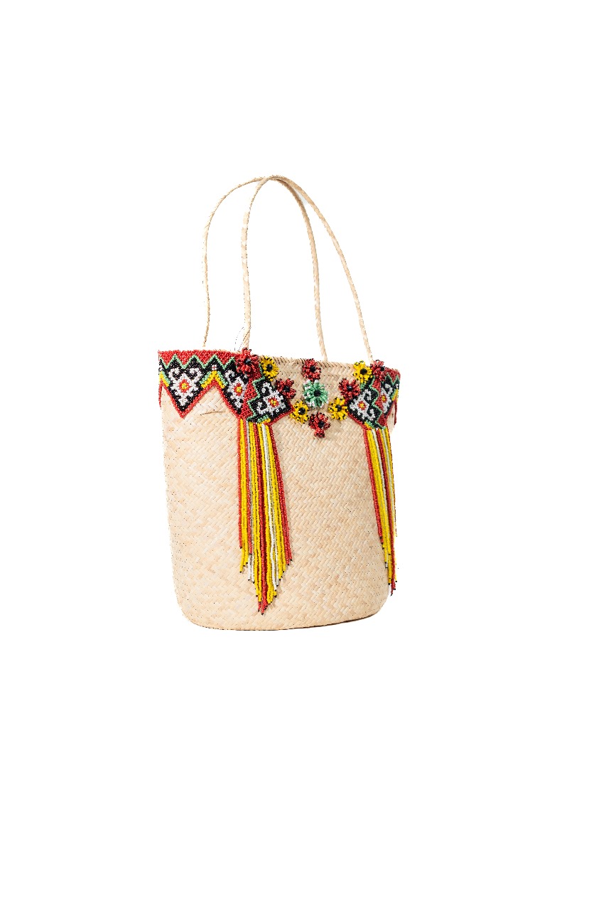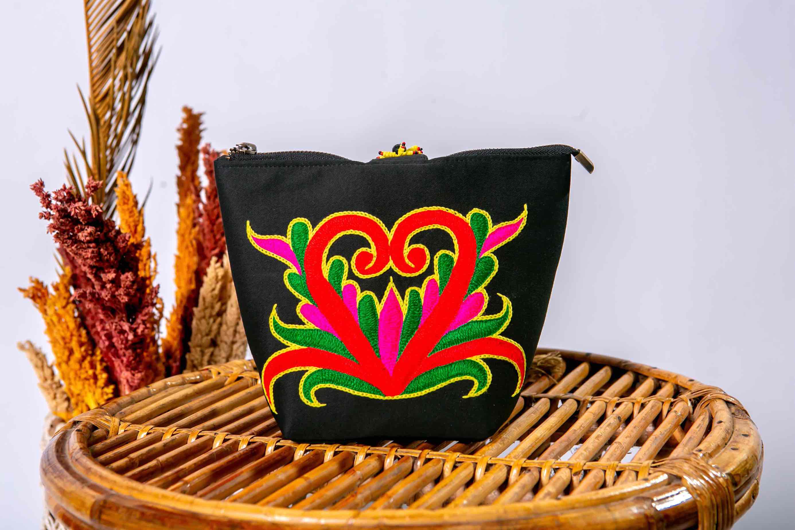 Terbuat dari paduan kain jumputan, bahan jeans warna navy dan kulit kayu, bagian dalam terdapat kantong sekat, kantong resleting dan 3 slot kartu. Dilengkapi dengan handel tangan terbuat dari kulit sintetis premium
