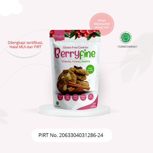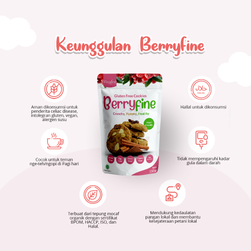 Berryfine adalah cookies sehat yang terbuat dari tepung singkong (Mocaf) organik terbaik dengan paduan kayu manis, biji-bijian, dan buah berry. Cocok dinikmati bersama keluarga. Selamat mencoba!