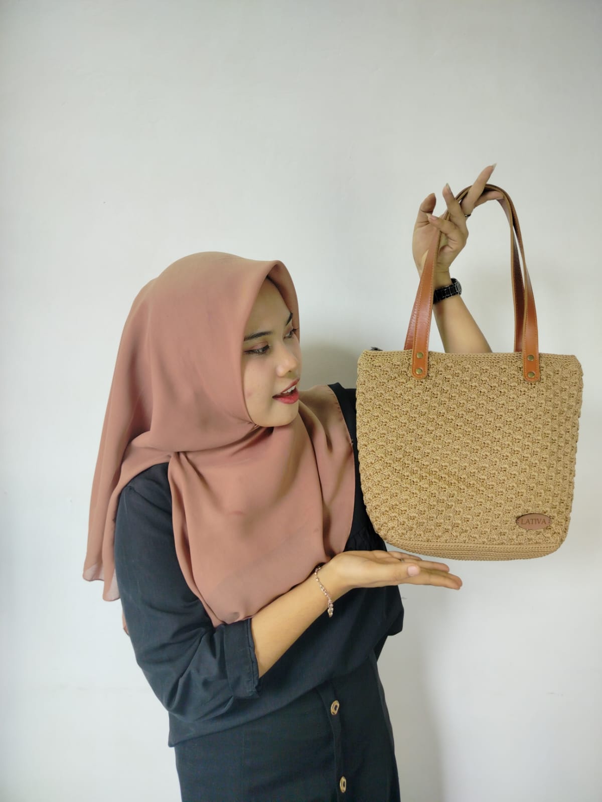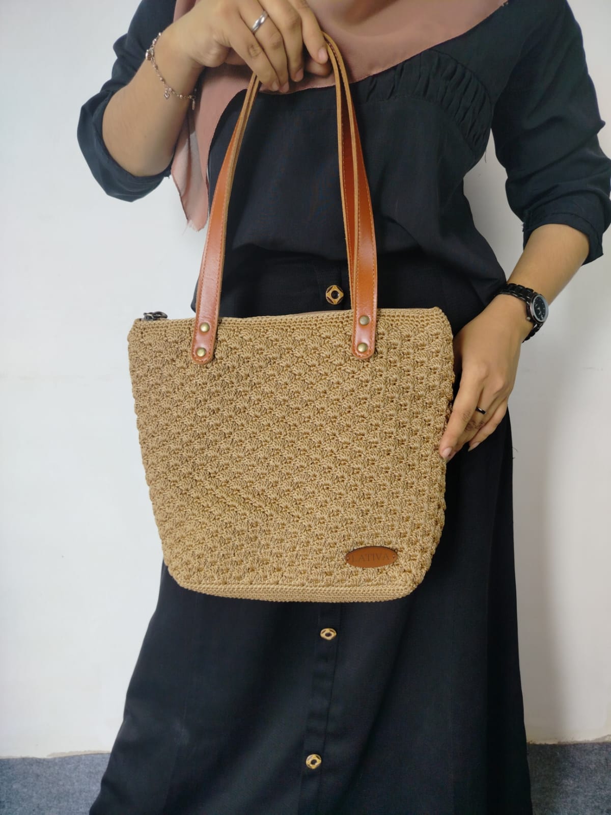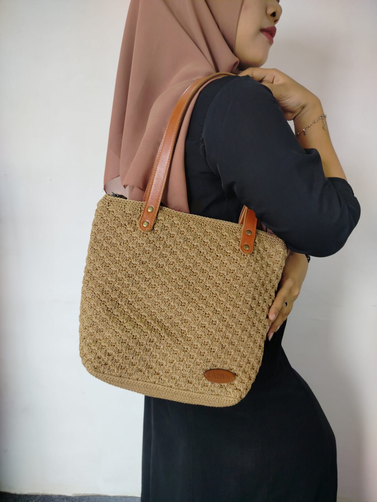 This knitted tote bag is very functional and aesthetic. It has a spacious interior without many compartments, making it suitable for casual activities, shopping, or carrying everyday items. Made from nylon knitting yarn with a unique fan pattern texture. The bag's handle can be carried or hung on the shoulder. The sweet light brown color is paired with light brown leather handles. This knitted bag is not only practical but also reflects a natural, warm, and casual style.
