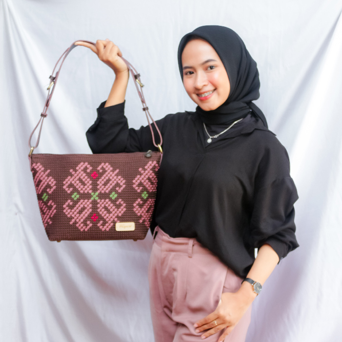 Raja Mote is a netted knitted bag adorned with a woven motif. This motif is adopted from the Balai Panjang weaving, which is a renowned product of Payakumbuh City. The motif is beautifully incorporated into the bag using the "jemput gendong" technique, enhancing its overall appearance.