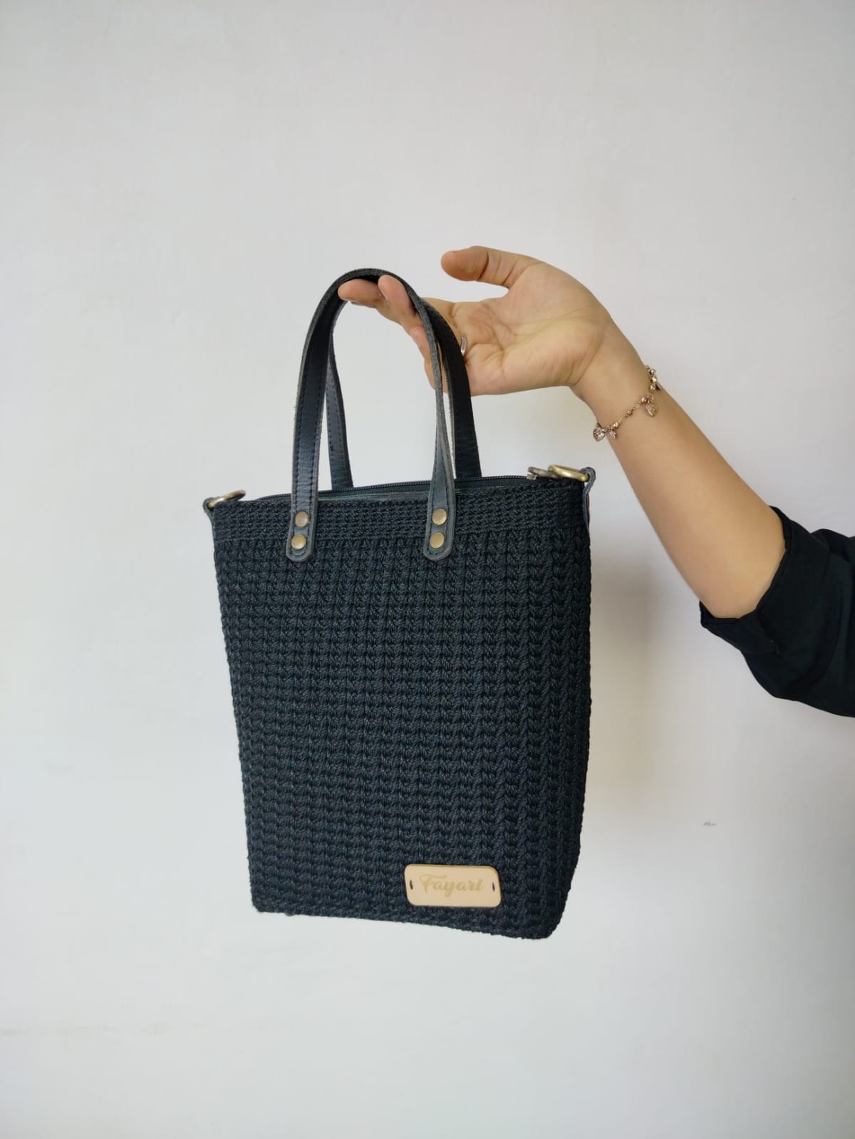 Raja Bambu is a netted crochet (knitwork) bag that features a plain V-shaped bamboo motif, enhanced with a genuine cow leather handle. The neat crochet work and consistent pattern make the product suitable for use in formal events.