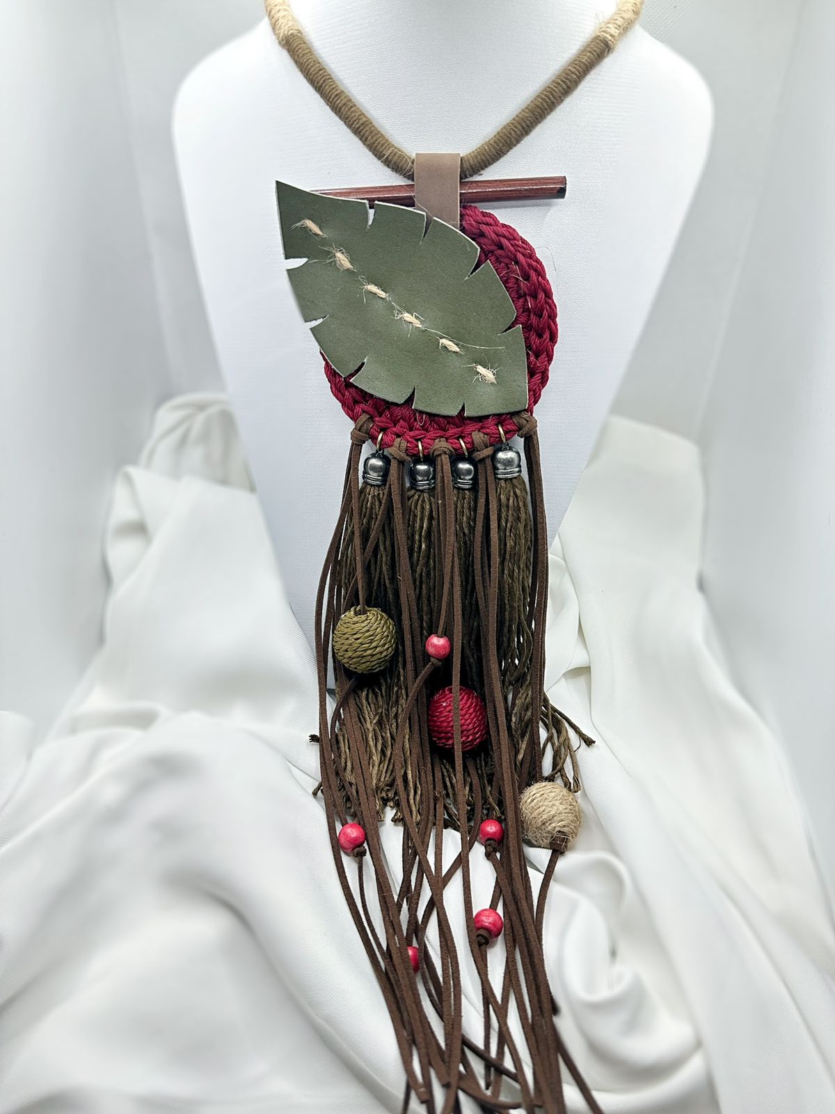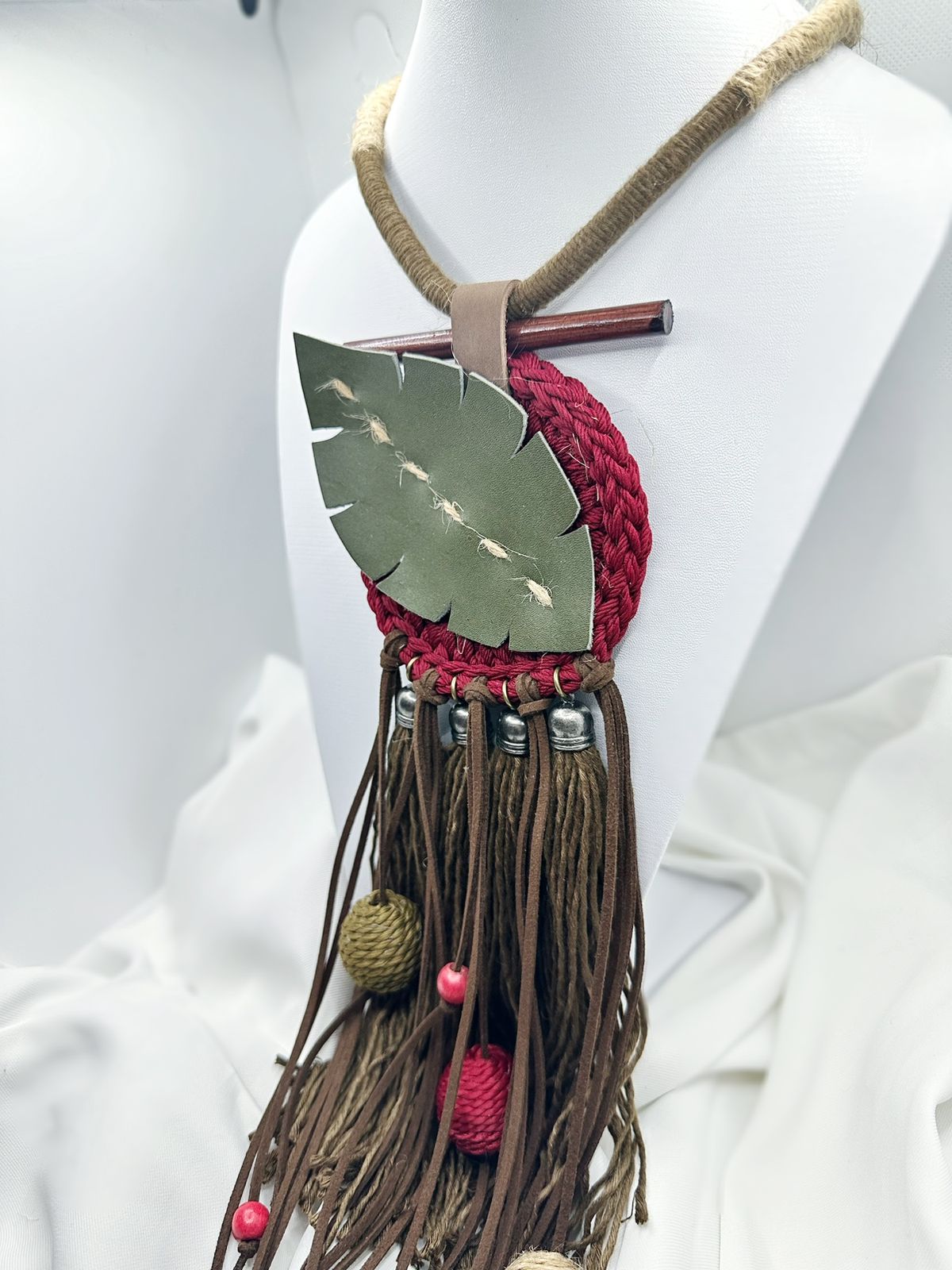 This Ethnic Leaf-Inspired Necklace brings a touch of nature into a beautifully artistic design. Featuring a leaf-shaped leather accent, it’s carefully combined with jute cord, wooden elements, and a soft cotton tassel to create a harmonious, earthy look.