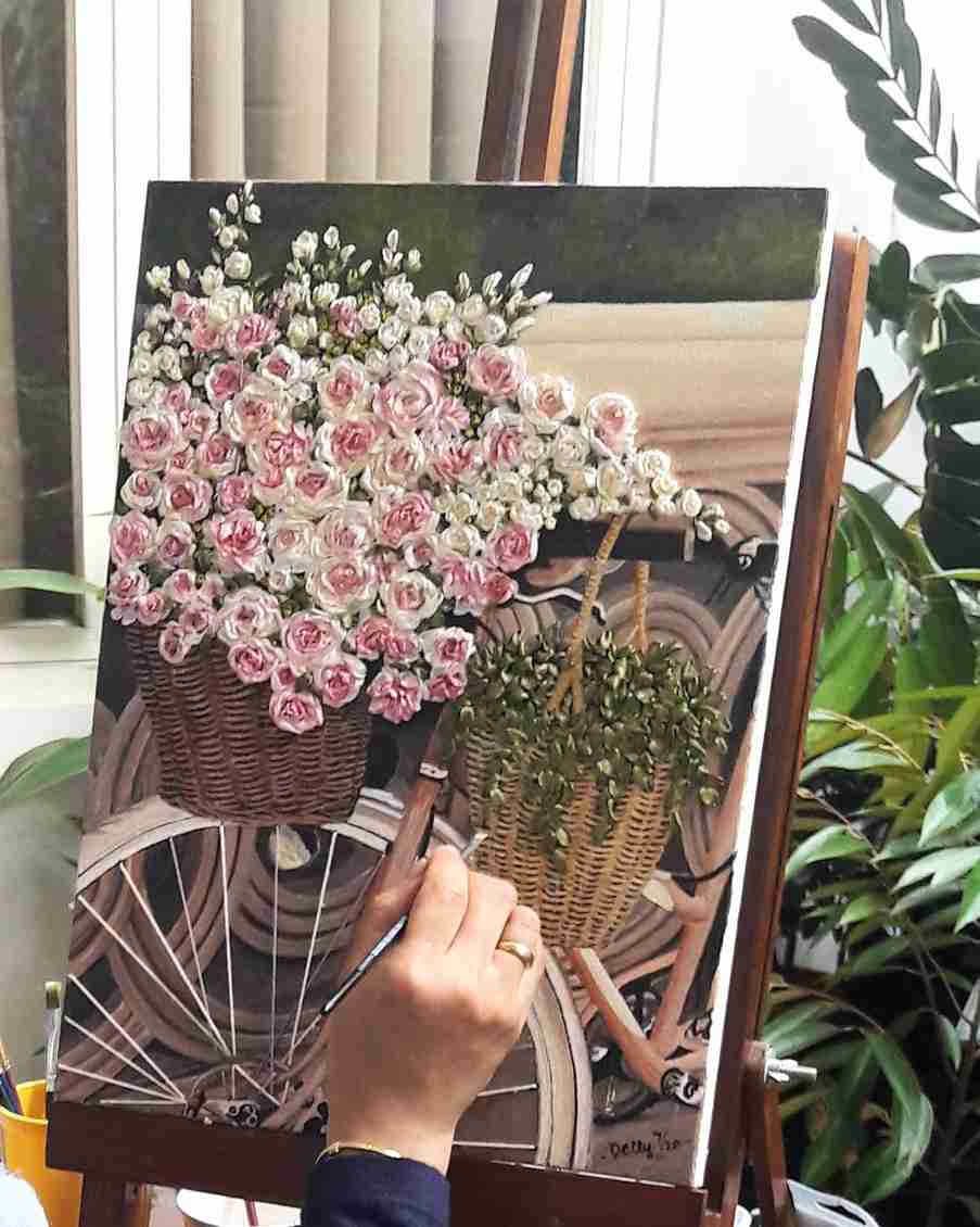 Material Type: Kain kanvas, cat akrilik, pita satin, benang katun, karton tebal, bingkai gipsum.