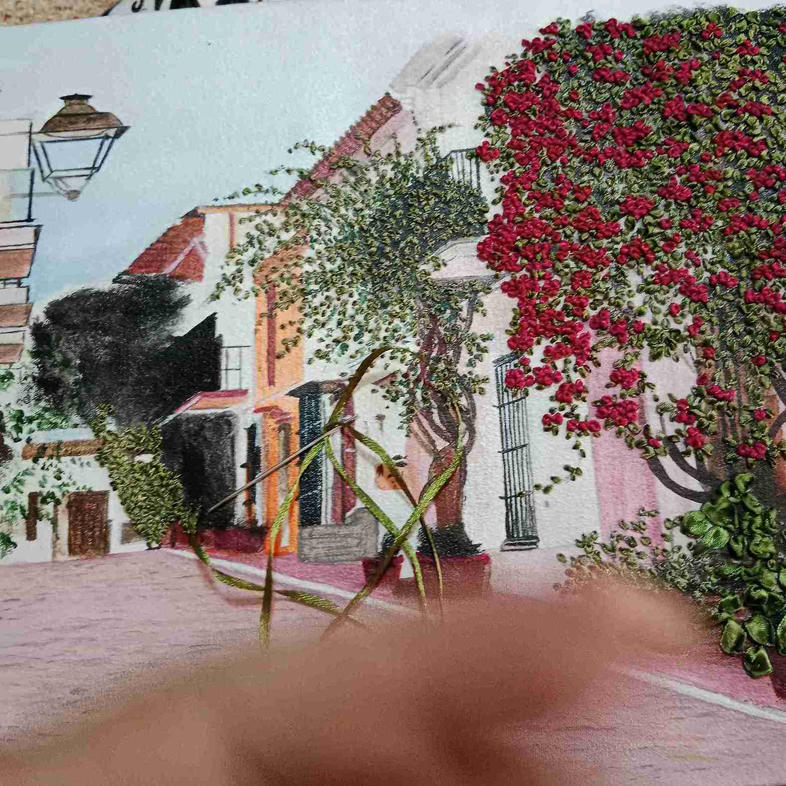 A beautiful totebag with combination of acrylic painting and ribbon embroidery.