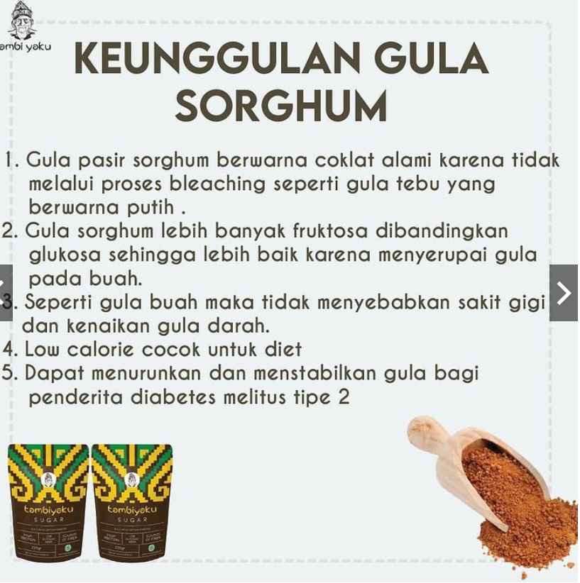 Tambiyaku is a South Kalimantan MSME engaged in agriculture and its processing. Tambiyaku produces a variety of healthy products made from Sorghum, namely Sorghum Rice, Sorghum Flour, Sorghum Sugar, Sorghum Soy Sauce, Sorghum Cookies Original and Almond Chocolate variants, as well as Popped Original and Gochujjang variants. Tambiyaku products maximize the use of land and sorghum plants (zero waste) because all parts of the sorghum plant can be processed into various kinds of products that do not cause waste, even the leaves and stem waste are intended for fattening superior livestock. Tambiyaku products are present in the community to address various kinds of problems, especially in the health sector diabetes, obesity, stunting, etc., Tambiyaku already has 213 partners at outlets spread throughout Indonesia such as South Kalimantan, Jakarta, West Java, Central Java, East Java, Medan, and various cities in other provinces.