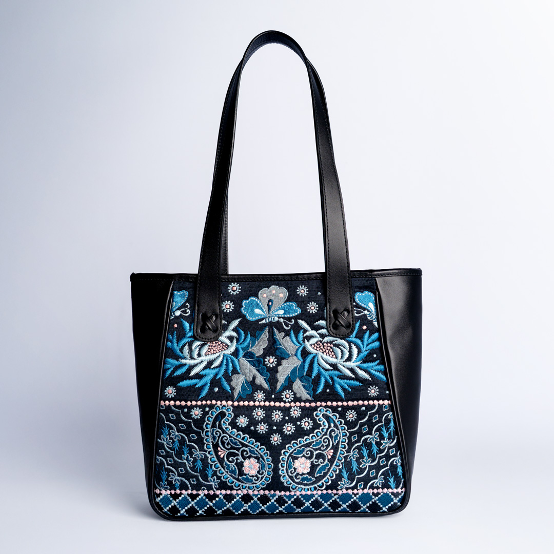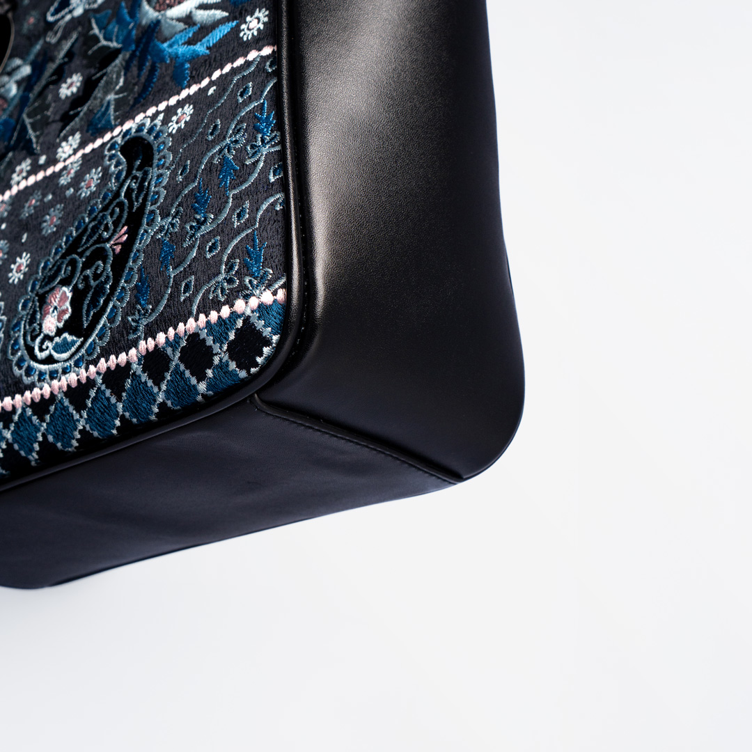 An embroidered bag beautifully combined with premium leather to create an elegant and refined piece.