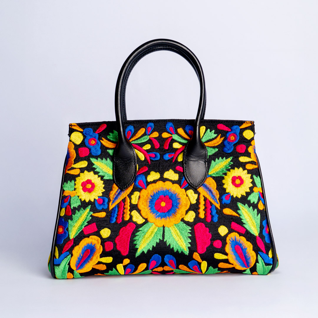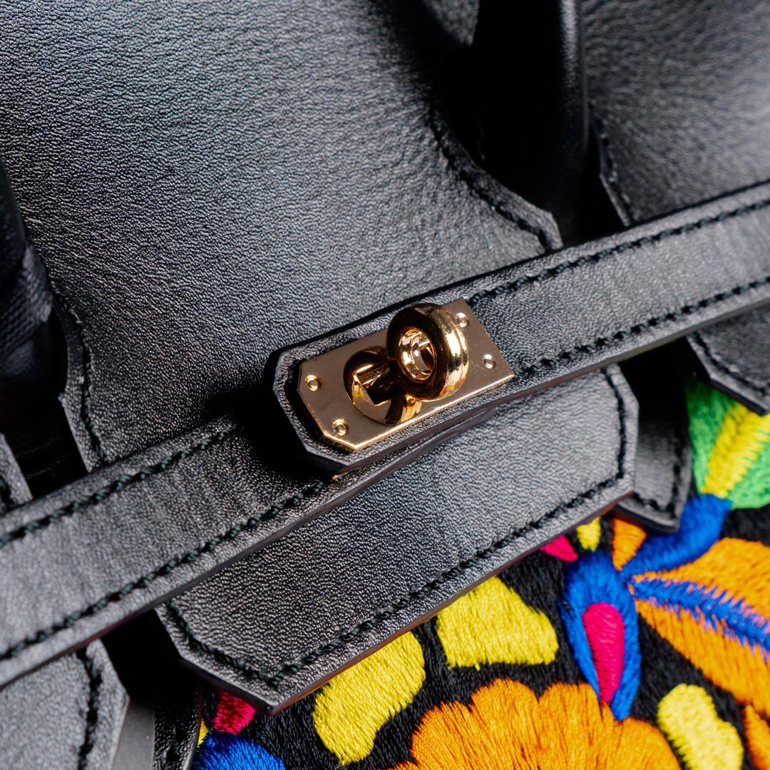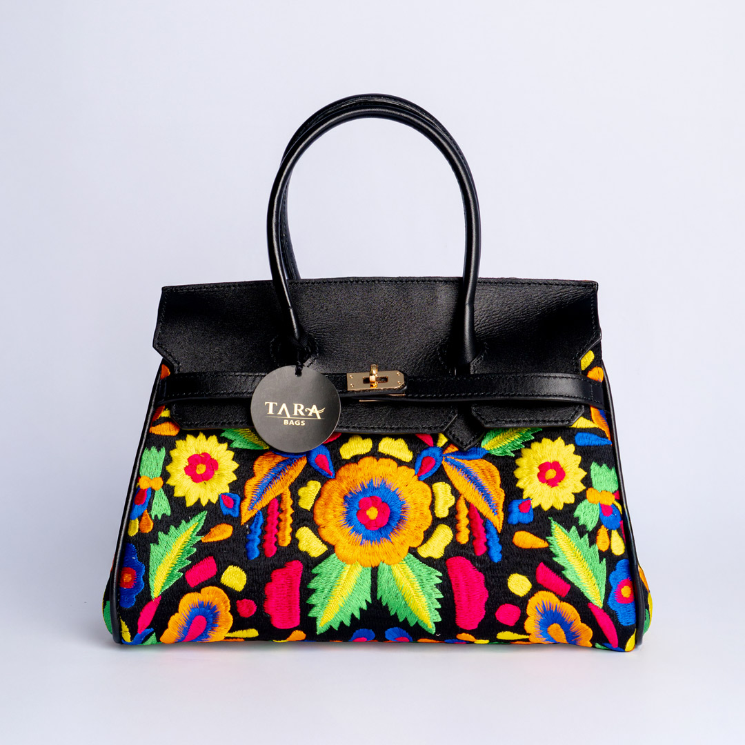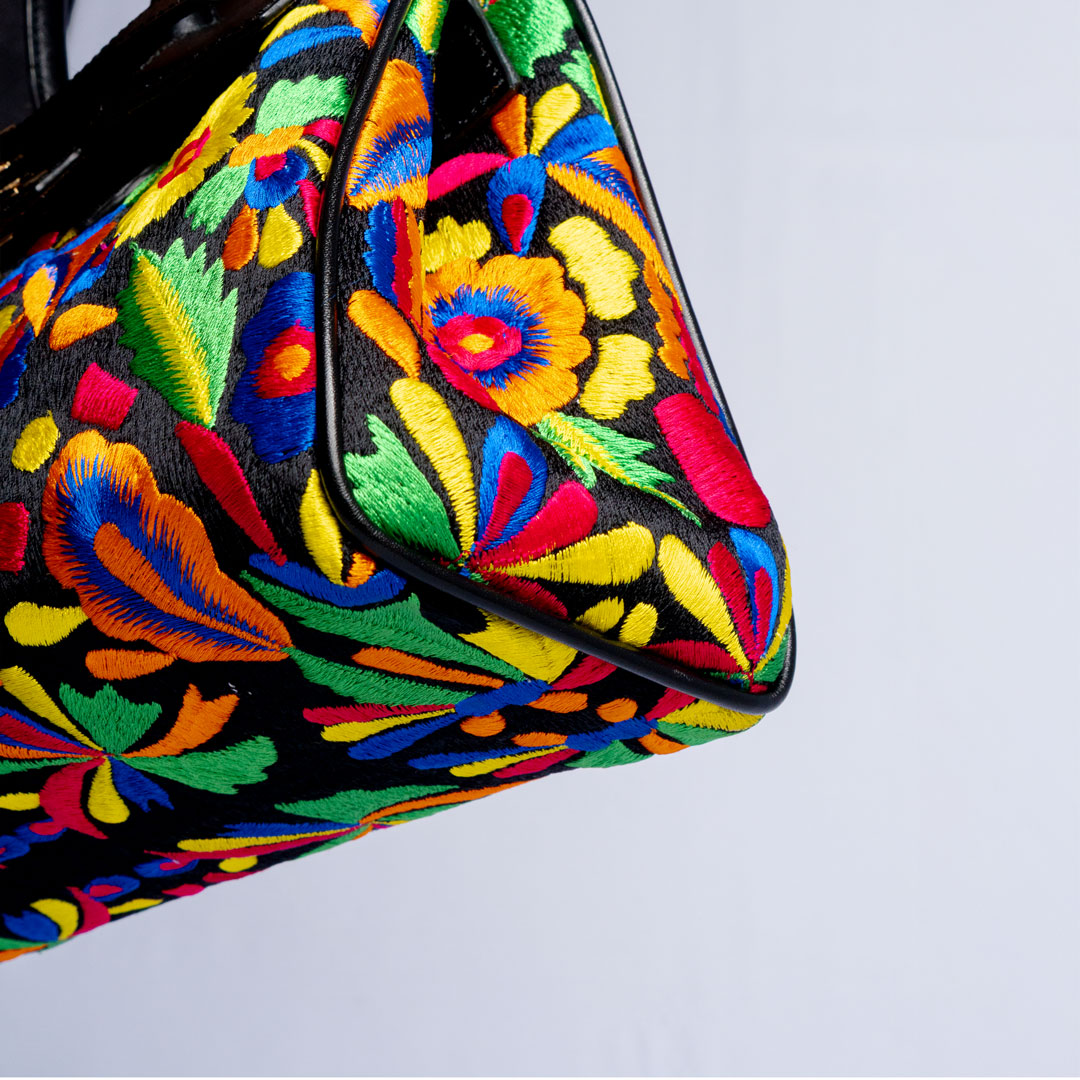 An embroidered bag beautifully combined with premium leather to create an elegant and refined piece.