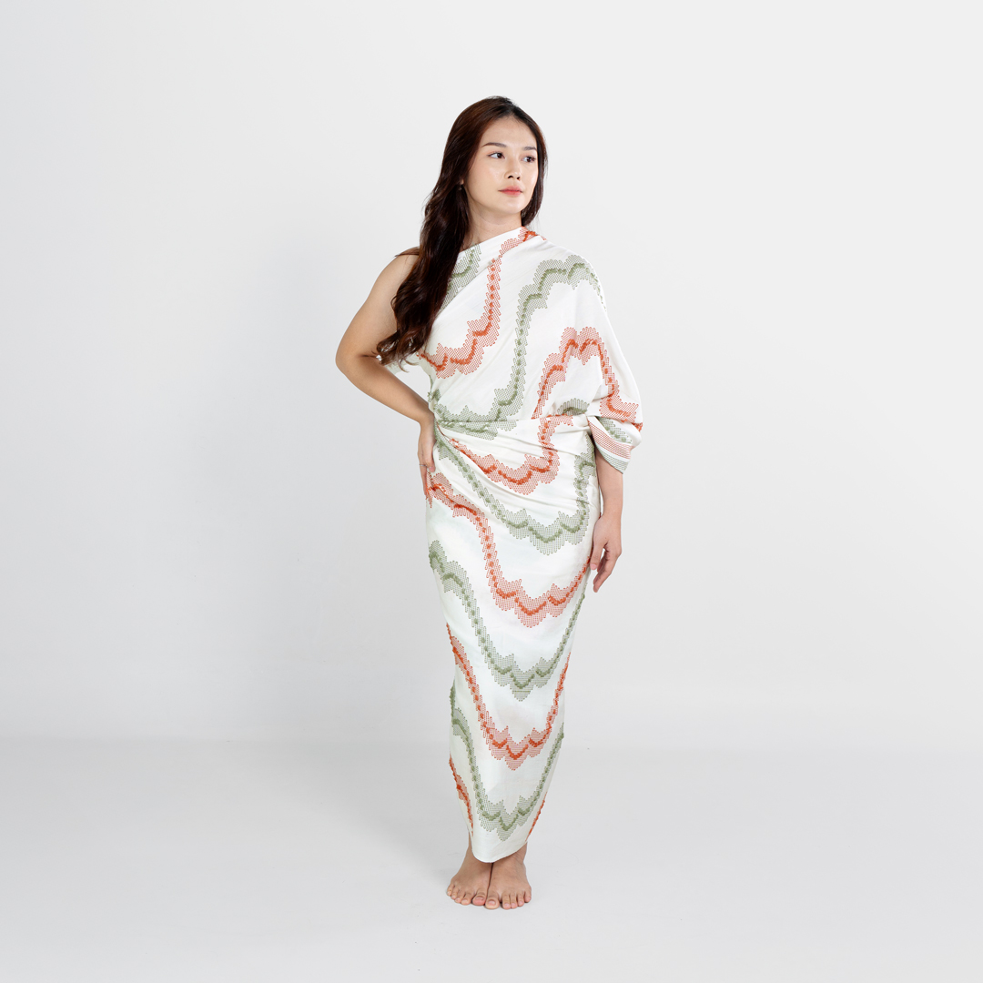 Pattern Meaning: Motif gelombang melambangkan arus kehidupan yang terus berjalan meski tak selalu tenang. Pesan “tetap teguh” mencerminkan ketegaran menghadapi perubahan, tetap melangkah meski dunia terus bergerak dan berubah.