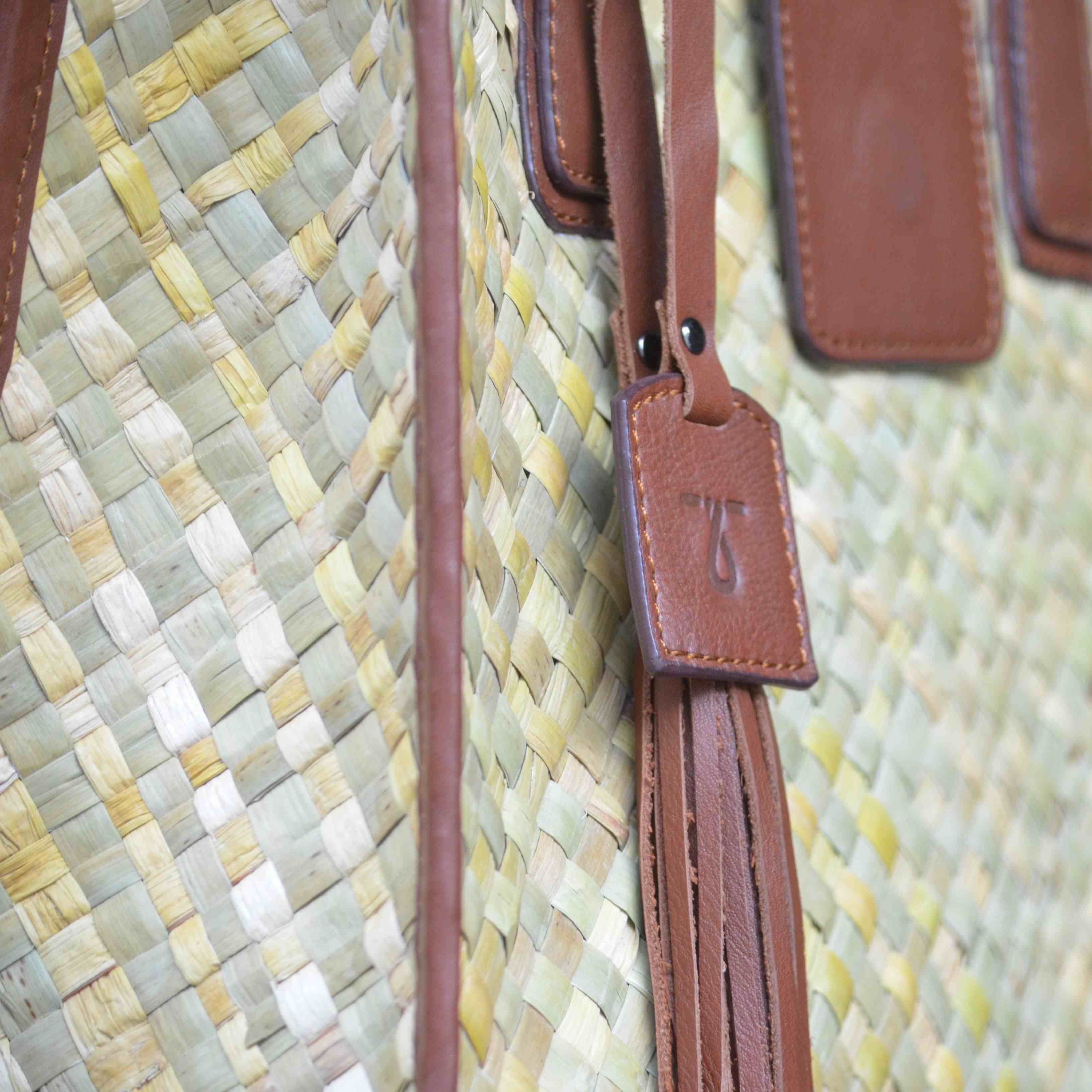 Material Type: Material berupa jalinan daun pandan untuk bagian lapis yg dikombinasikan dengan Kulit Sapi Kualitas Ekspor. (Material in the form of braided pandanus leaves for the lining combined with Export Quality Cow Leather)
