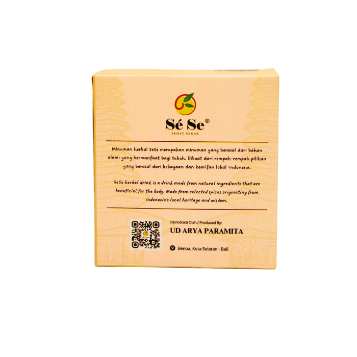 UD Arya Paramita was founded in 2011. We have produced "Jamu" or Indonesian Herbal Drink with brand "SEHAT SEGAR" but then changed its name to "SE SE" since late 2020 according the Intellectual Property Law in Indonesia. We produce herbal drink in liquid ones, instant herbal drink, and candy. With no preservatives and no artificial sweetener, we use natural spices from local farmers. Our packaging is easy to take everywhere when you're traveling. Nowadays, "Se Se" has been sold even outside Bali, even in worldwide. Our motto is "Jamu is delicious, Jamu is fun. Let's drink Jamu everyday." We want to make Jamu "Se Se" being known in global worldwide.