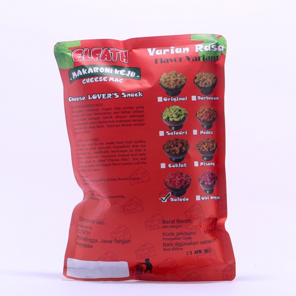 Elfath makaroni keju rasa keju balado merupakan camilan khas nusantara dengan kualitas terbaik. Camilan sehat bebas gluten ini dibuat langsung dari keju cheddar berkualitas. Penambahan bumbu khas sambal balado memberikan keunikan pada citarasa makaroni keju balado ini. Diolah tanpa menambahkan bahan pendawet dan diproses secara higienis dengan selalu mengedepankan mutu demi terjaganya kualitas produk.