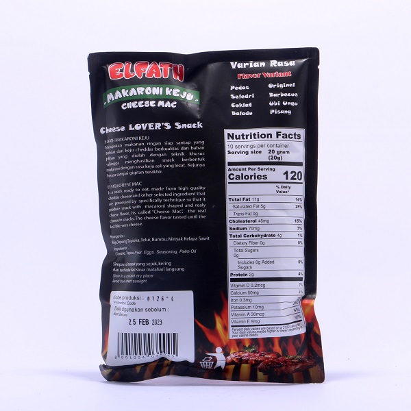 Diproduksi secara higienis dan tanpa menggunakan bahan pengawet membuat snack makaroni keju aman untuk dikonsumsi segala usia. Nikmati kebaikan keju dari ELFATH Makaroni Keju.