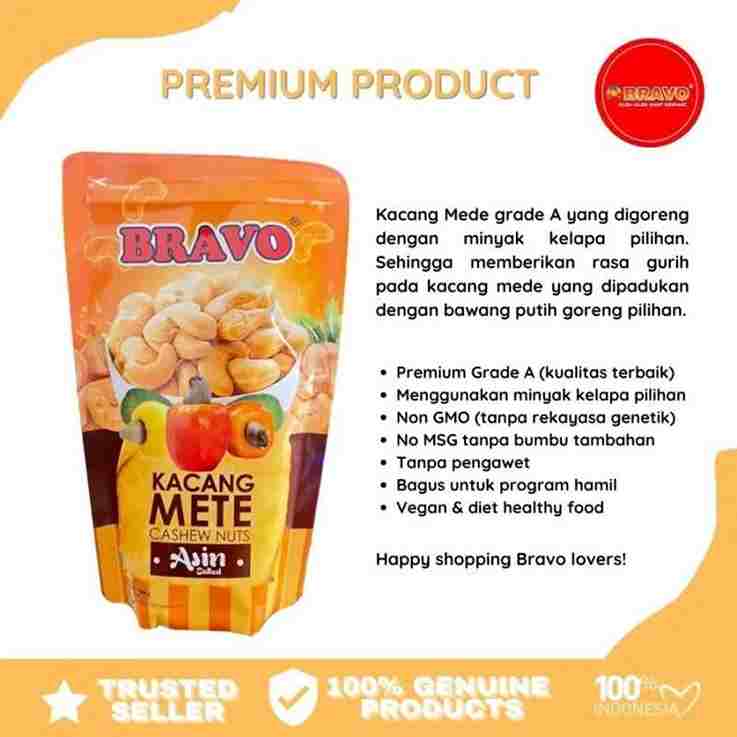 BRAVO Fried Salted Cashew Nuts is a premium snack made from high quality Grade A cashew nuts. This product is fried in selected coconut oil and combined with crispy fried garlic slices, creating a savory, delicious and natural taste without the addition of harmful chemicals.