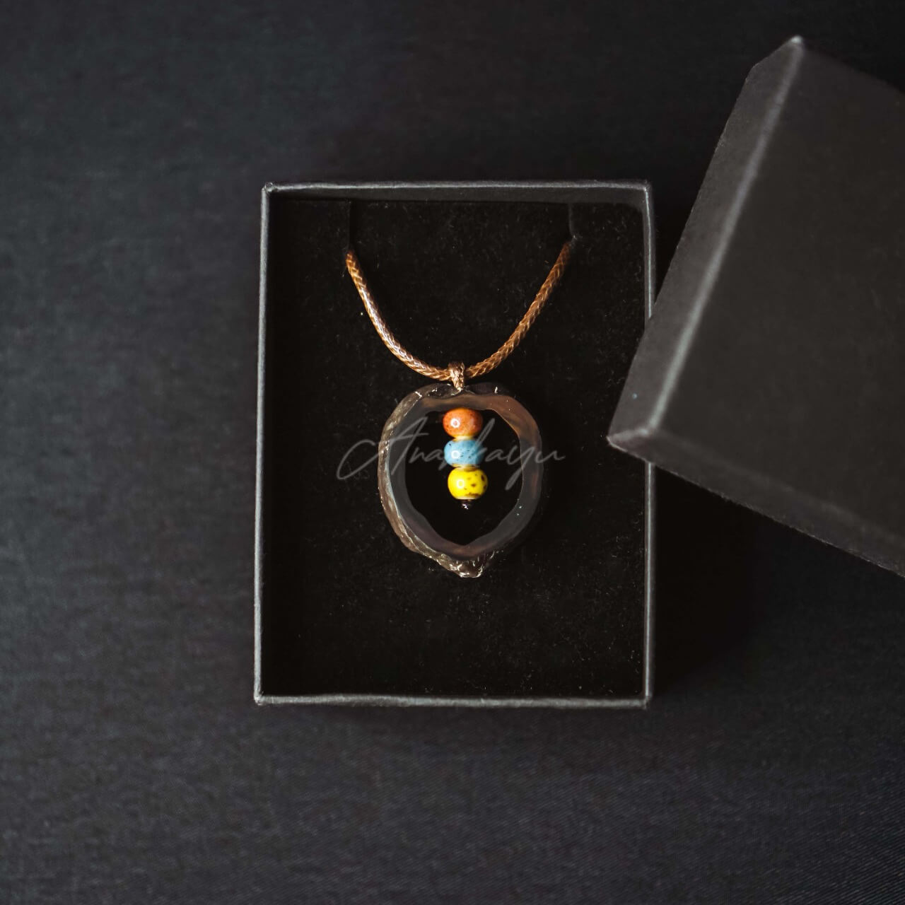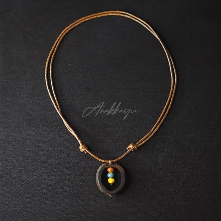 Material Type: Liontin luar : Kemiri; Liontin Dalam : 3 biji Keramik; Tali : Kulit Sintetis