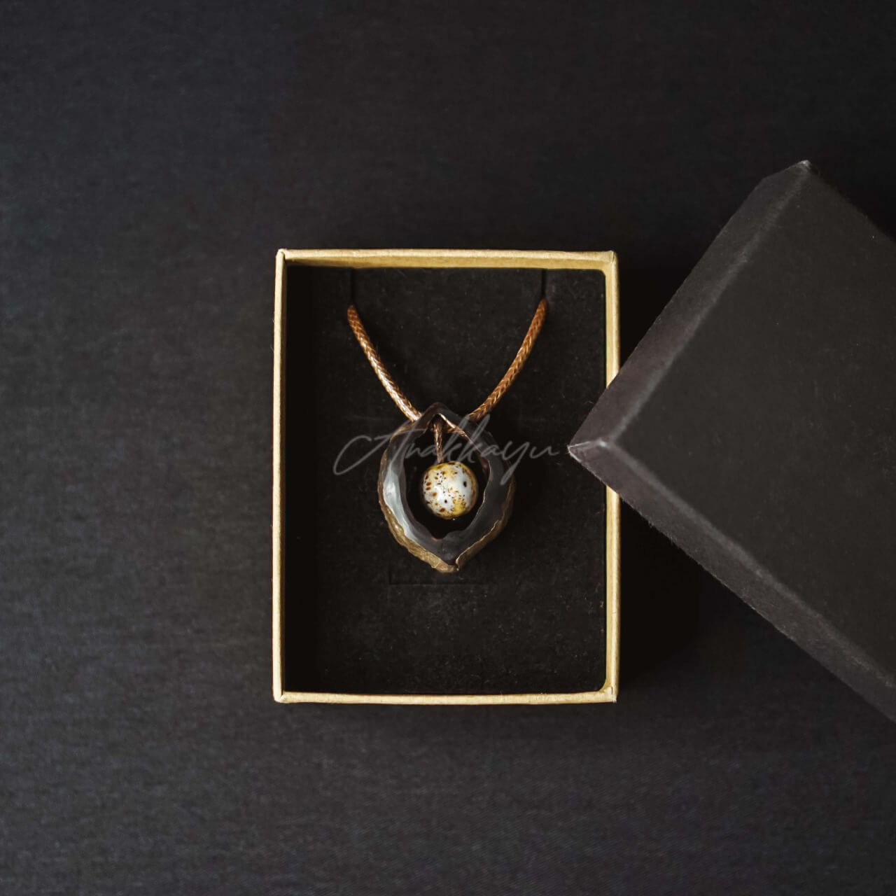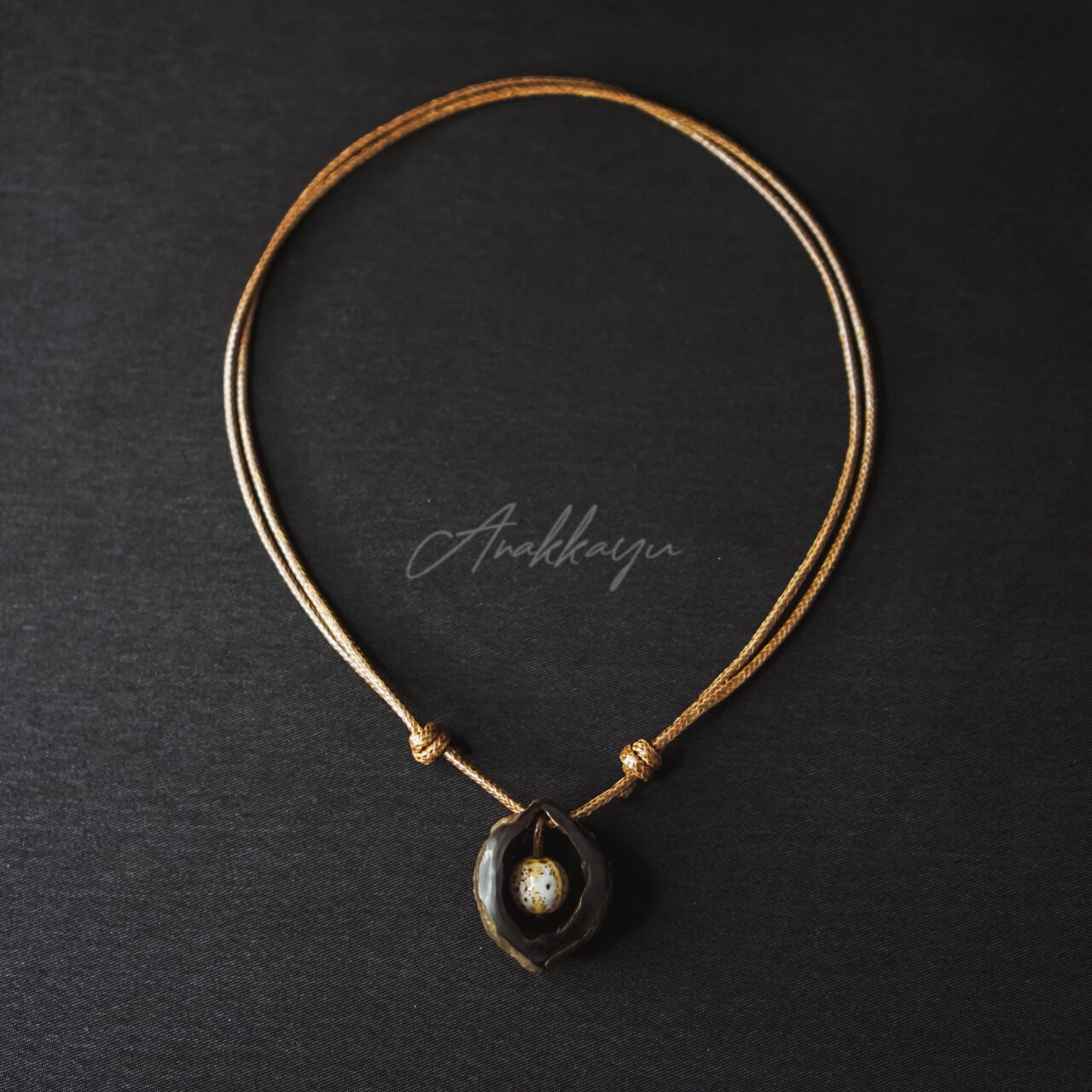 Material Type: Liontin luar : Kemiri; Liontin Dalam : Keramik; Tali : Kulit Sintetis