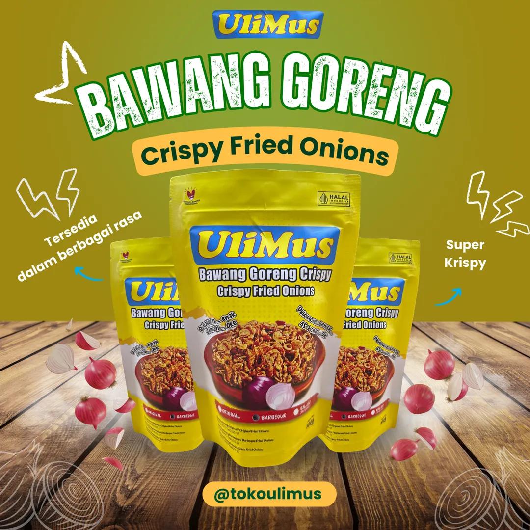 I started my ULiMus Crispy Fried Onions business in 2020 due to children's dislike of fried onions. Created by trial and error UliMus Crispy Fried Onions was born. My children loved my crispy fried onions. In June 2022 I joined MSME Jakpreneur from the DKI Jakarta Government, Ulimus crispy fried onions, are premium quality fried onions to suit your taste. Enjoy the savory and crunchy sensation of our delicious fried onions. We also have legal permits such as, HALAL, MD-BPOM, P-IRT, has been tested by a recognized laboratory. Ulimus Crispy Fried Onions are a fusion of traditional meets new age. Delicious as a garnish ... Even tastier as a snack, in 3 flavor variants:* Original, * Barbeque, * Balado.