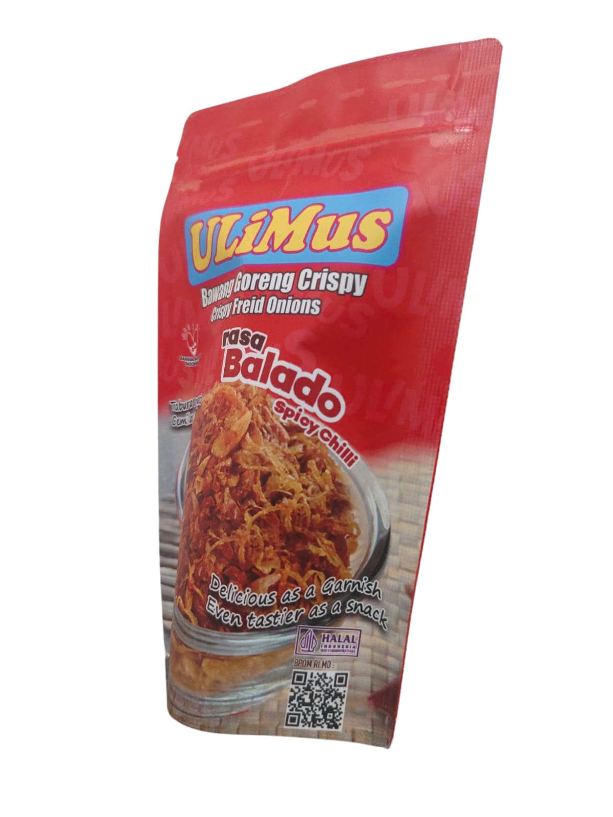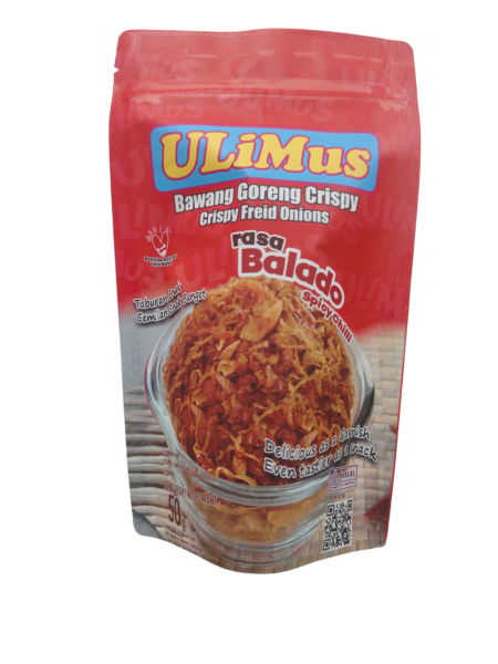 Ulimus Crispy Balado Fried Onions are a crispy fried onion product with a spicy and savory balado (Spicy Chilli) taste. These fried onion are made from high quality shallots thinly sliced and fried until dry and crispy, with a special balado spices seasoning. This product is delicious as a snack or as a garnish to dishes such as rice, noodles or soto/soup. Its spicy taste and crunchy texture make it a favorite of many people.