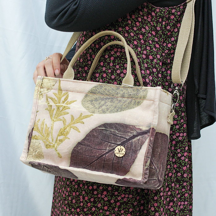 Once the ecoprint fabric is ready, it is then sewn into a bag using quality materials and stitches with thick nylon thread, making the bag sturdy and durable. The bag is lined with water-resistant lining and has multiple compartments to keep the items inside the bag organized.