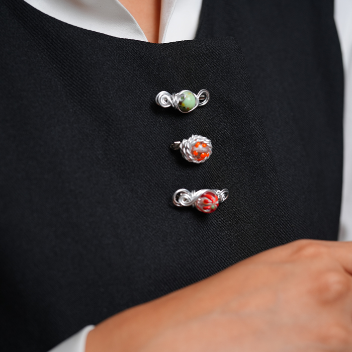 Tiny pins that combine colorful charm and elegant form, wrapped in delicately woven wire. Each pin is made with recycled glass beads in floral patterns, creating a playful yet aesthetic look. Perfect for adding a sweet touch to your hijab, scarf, or daily outfits. Available in cheerful color sets, each pack includes 3 unique, one-of-a-kind pins you won’t find anywhere else.