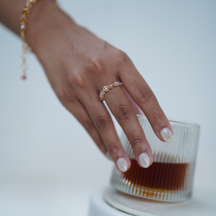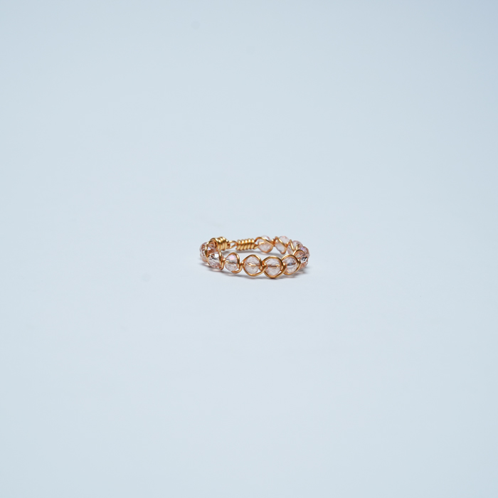 A handmade full-circle ring crafted with gold copper wire and handpicked crystals that reflect elegant sparkle. Using the twist wrapping technique, this ring offers a look that’s simple yet classy. Perfect to wear on its own for a subtle statement or paired with other rings as a stylish stacking piece.