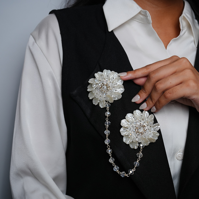 Dua bunga penuh detail dihubungkan oleh rantai kristal berkilau, menciptakan aksen yang tak hanya indah, tapi juga memberi kesan lembut dan berkelas.