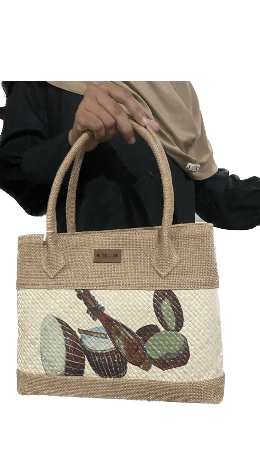 Tas ini merupakan hasil dari kreasi decoupage dengan keunikan di motifnya yang berasal dari tissue bermotif di atas media anyaman pandan. Inovasi kami di tas ini adalah dengan menggunakan tissue dengan motif kearifan lokal khas Bangka Belitung yaitu alat music dambus. Tas ini memiliki ukuran yang medium dan dilengkapi dengan penutup resleting, stok tersedia dan bisa dipesan dalam jumlah banyak dengan sistem PO serta bisa juga costum motif nya.
