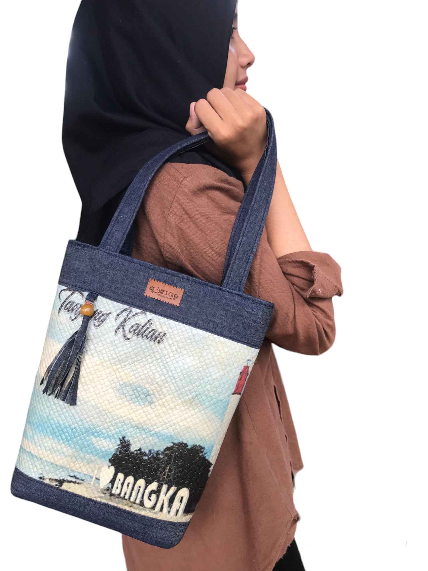 Tas Tangan Jeans Motif Mercu Suar Tanjung Kalian I Love Bangka