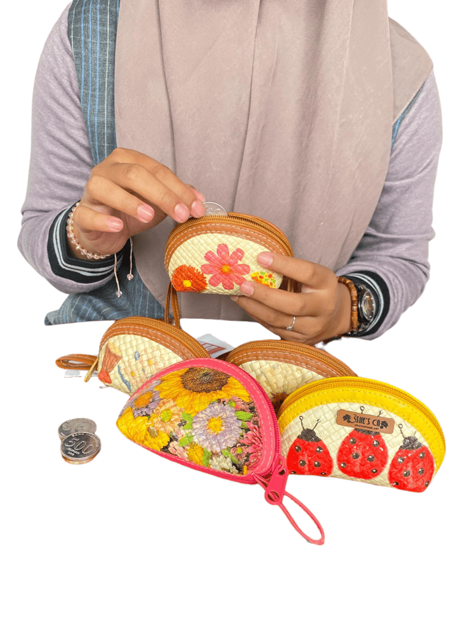 Dompet ini merupakan hasil dari kreasi decoupage dengan keunikan di motifnya yang berasal dari tissue bermotif di atas media anyaman pandan. Inovasi kami di tas ini adalah menggunakan tissue dengan berbagai motif local maupun umum. Dompet ini memiliki ukuran yang kecil dan ada resleting. Stok tersedia dan bisa dipesan dalam jumlah banyak dengan sistem PO. Serta bisa juga costum untuk motifnya.