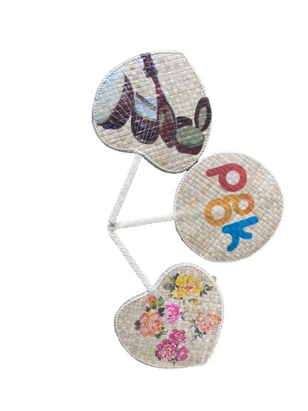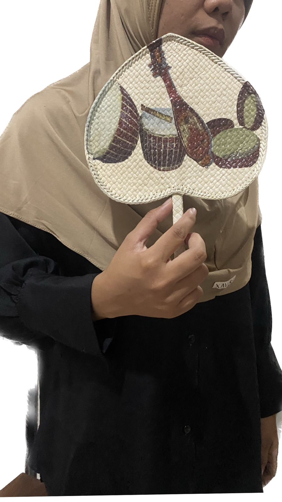 Kipas ini merupakan hasil dari kreasi decoupage dengan keunikan di motifnya yang berasal dari tissue bermotif di atas media anyaman pandan. Inovasi kami di kipas ini adalah dengan menggunakan tissue dengan motif kearifan lokal khas Bangka Belitung yaitu Alat Musik Dambus, ada juga motif ketuyut, dan lain sebagainya.