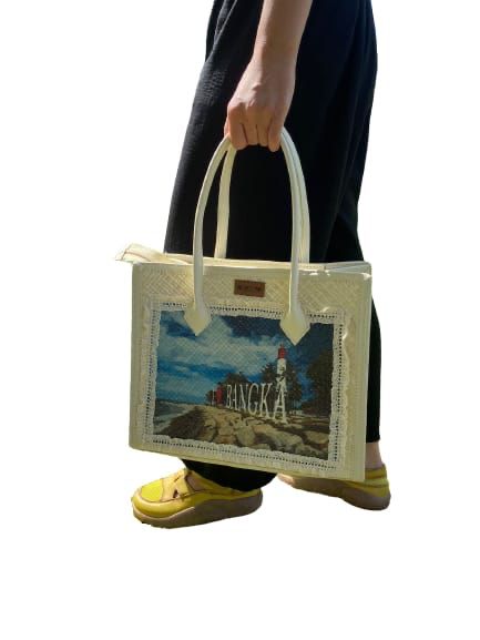 Tas ini merupakan hasil dari kreasi decoupage dengan keunikan di motifnya yang berasal dari tissue bermotif di atas media anyaman pandan. Inovasi kami di tas ini adalah dengan menggunakan tissue dengan motif kearifan lokal khas Bangka Belitung yaitu mercu suar di Tanjung Kalyan dengan tulisan I Love Bangka. Tas ini memiliki ukuran yang medium dan dilengkapi dengan resleting. Stok tersedia dan bisa dipesan dalam jumlah banyak dengan sistem PO. Serta bisa juga costum motif nya.