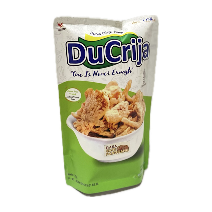 Keripik jamur tiram DuCrija Snack, mengunakan bahan baku dari jamur tiram segar, yang di olah menggunakan tepung bebas gluten, melalui proses oven dan menggunakan rempah rempah pilihan