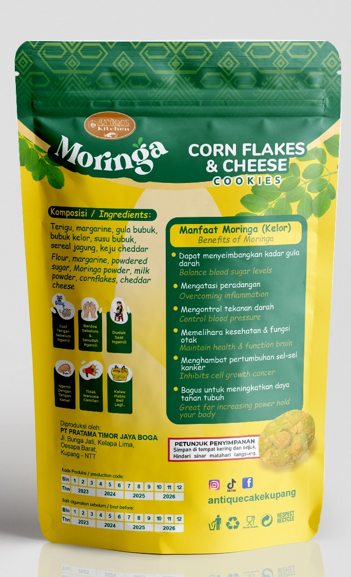 Kandungan Bahan: terigu, margarine, gula bubuk, bubuk kelor ( moringa ), susu bubuk, corn flakes, keju cheddar
