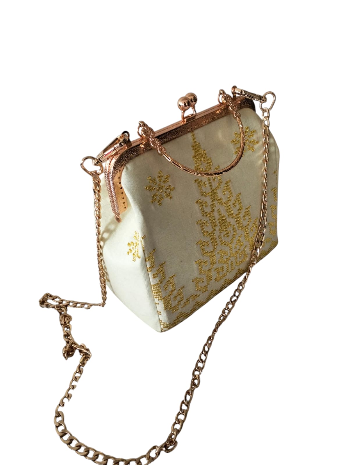 Bagian frame logam memberikan kesan vintage sekaligus kokoh, sementara detail jahitan halus mencerminkan kualitas pengerjaan handmade oleh para ibu rumah tangga terampil binaan Aya_ko.