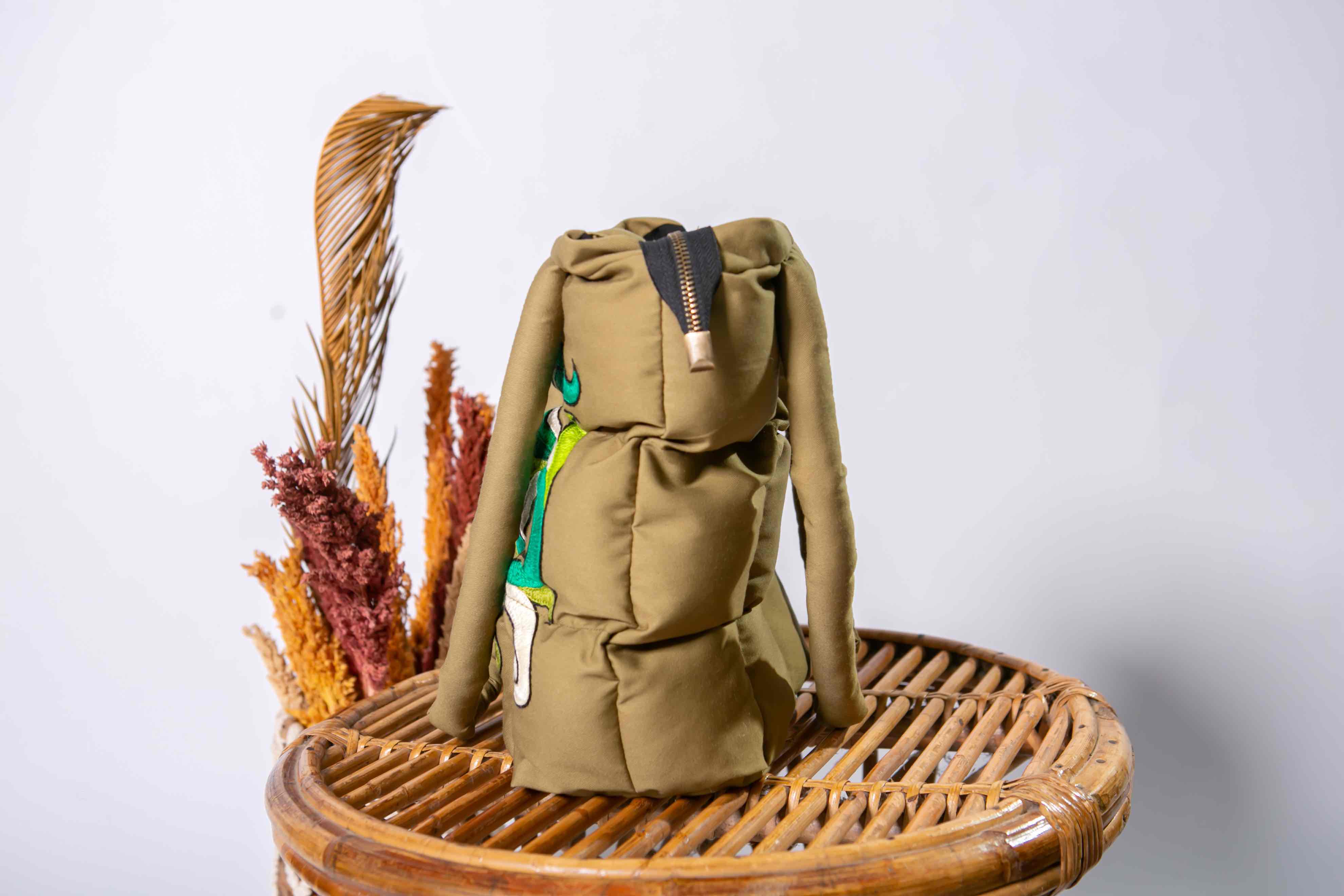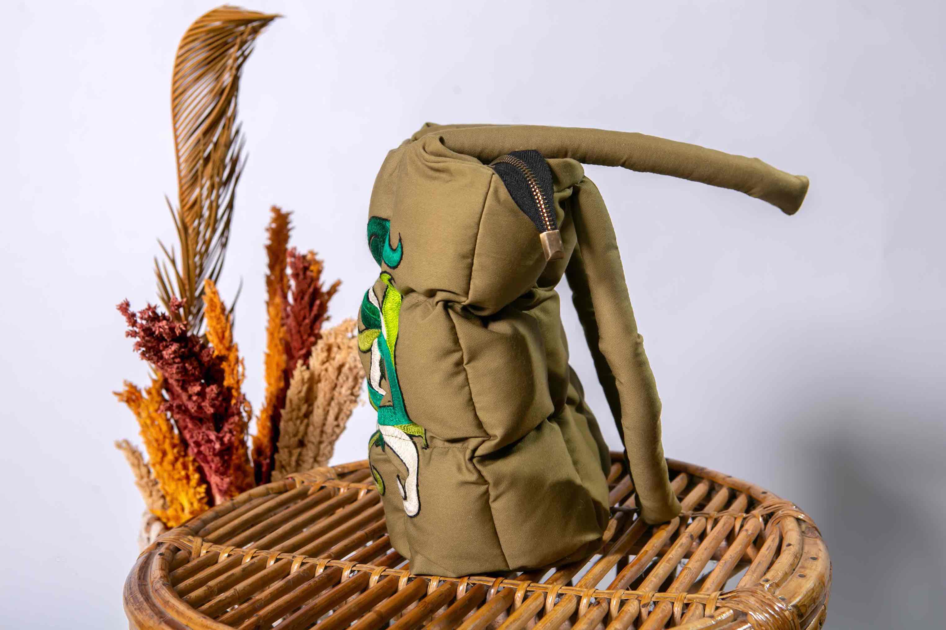 Puffy bag etnik dengan sulaman motif Dayak. Tas ini terbuat dari bahan kain berwarna hijau zaitun dan memiliki desain berlapis yang tampak empuk dan bertekstur. Bagian depan puffy bag dihiasi sulaman indah dengan motif simetris khas Kalimantan Timur, menggunakan nuansa warna hijau emerald, hijau limau, putih gading, dan hitam.
