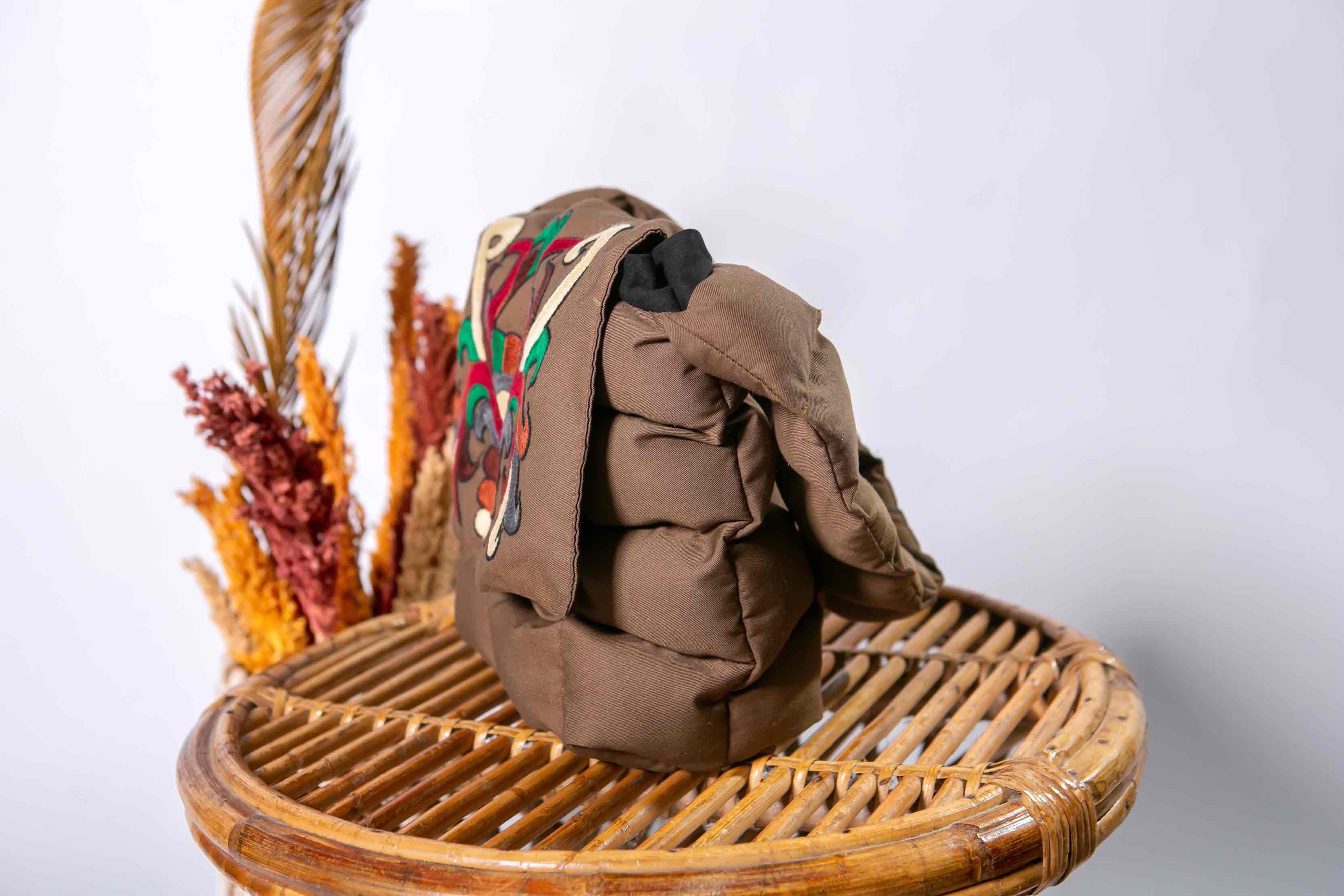 Puffy bag etnik dengan sulaman motif Dayak. Tas ini terbuat dari bahan kain berwarna hijau zaitun dan memiliki desain berlapis yang tampak empuk dan bertekstur. Bagian depan puffy bag dihiasi sulaman indah dengan motif simetris khas Kalimantan Timur, menggunakan nuansa warna hijau emerald, hijau limau, putih gading, dan hitam.