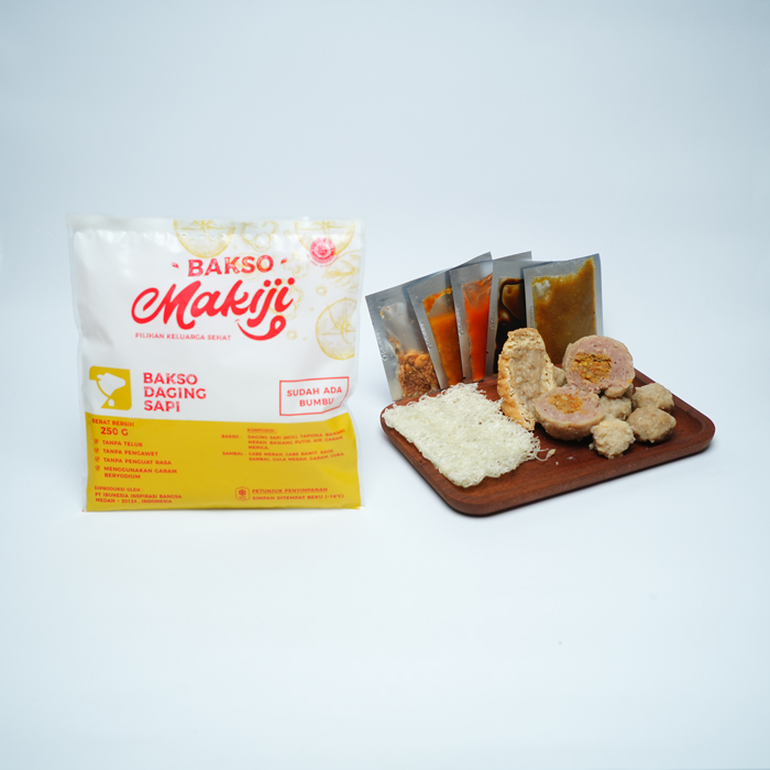 Varian paling lengkap dari Makiji yang berisi 5 bakso sapi, 1 tahu bakso, 1 Cincang pedas ,1 urat dilengkapi dengan bihun kering, bumbu sop, bawang goreng, cabe sambal, saos dan kecap